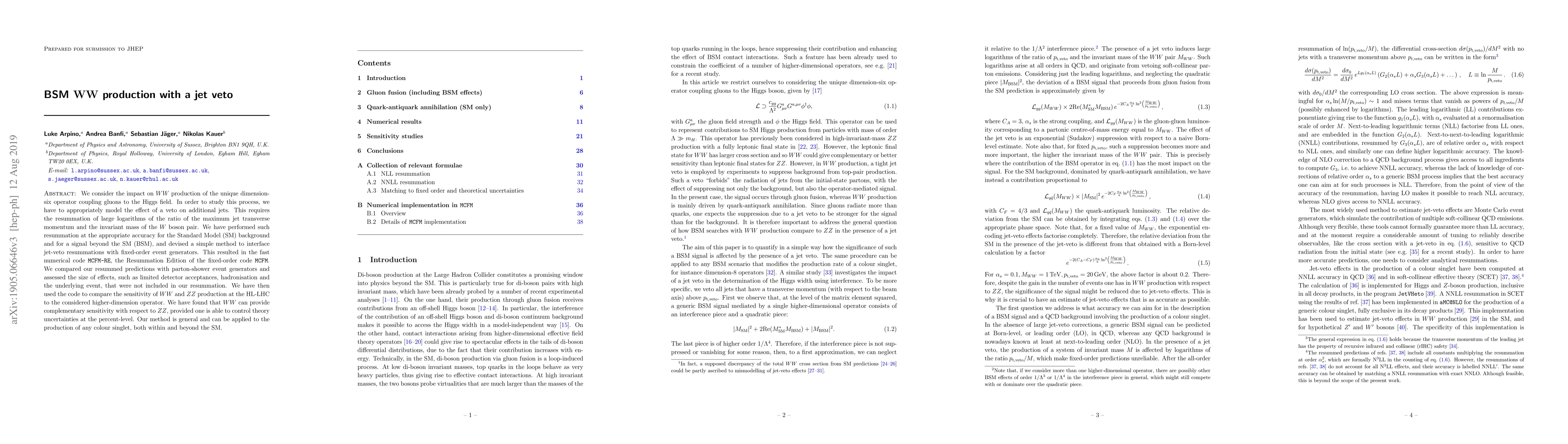 We consider the impact on WW production of the unique dimension-six operator coupling gluons to the Higgs field. In order to study this process, we have to appropriately model the effect of a veto on additional jets. This requires the resummation of large logarithms of the ratio of the maximum jet transverse momentum and the invariant mass of the W boson pair. We have performed such resummation at the appropriate accuracy for the Standard Model (SM) background and for a signal beyond the SM (BSM), and devised a simple method to interface jet-veto resummations with fixed-order event generators. This resulted in the fast numerical code MCFM-RE, the Resummation Edition of the fixed-order code MCFM. We compared our resummed predictions with parton-shower event generators and assessed the size of effects, such as limited detector acceptances, hadronisation and the underlying event, that were not included in our resummation. We have then used the code to compare the sensitivity of WW and ZZ production at the HL-LHC to the considered higher-dimension operator. We have found that WW can provide complementary sensitivity with respect to ZZ, provided one is able to control theory uncertainties at the percent-level. Our method is general and can be applied to the production of any colour singlet, both within and beyond the SM.