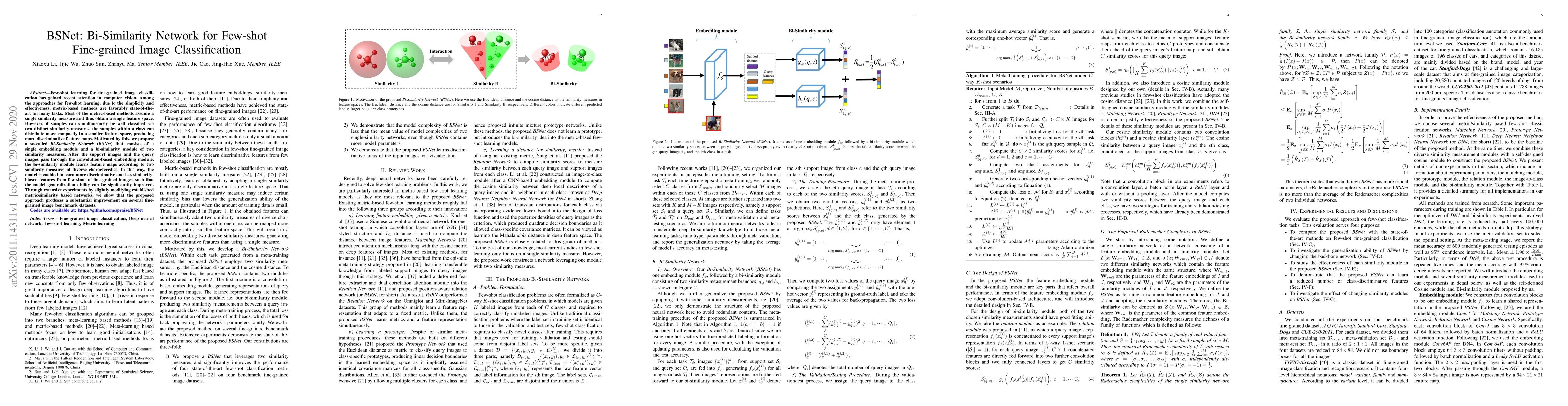 The BSNet proposes a Bi-Similarity Network for enhancing few-shot fine-grained image classification by utilizing two distinct similarity measures to learn more discriminative features. This dual approach significantly improves model generalization compared to single similarity metric methods.
