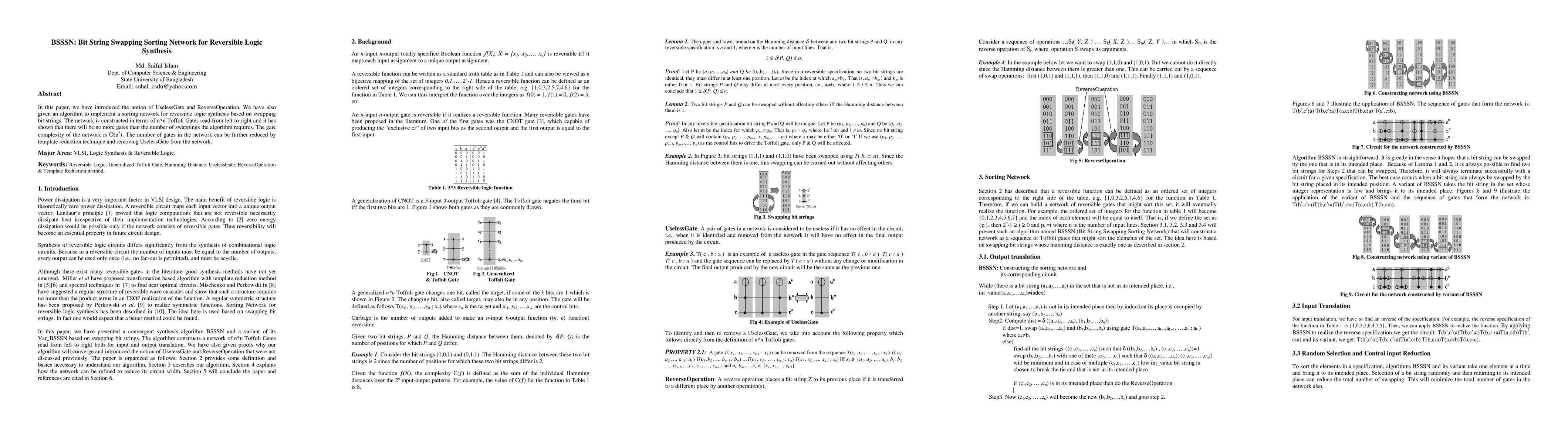 This paper introduces a reversible logic synthesis method called BSSSN, which utilizes bit string swapping to construct a sorting network using Toffoli gates. The network's gate complexity is O(n²), and it can be optimized by eliminating UselessGates and applying template reduction.