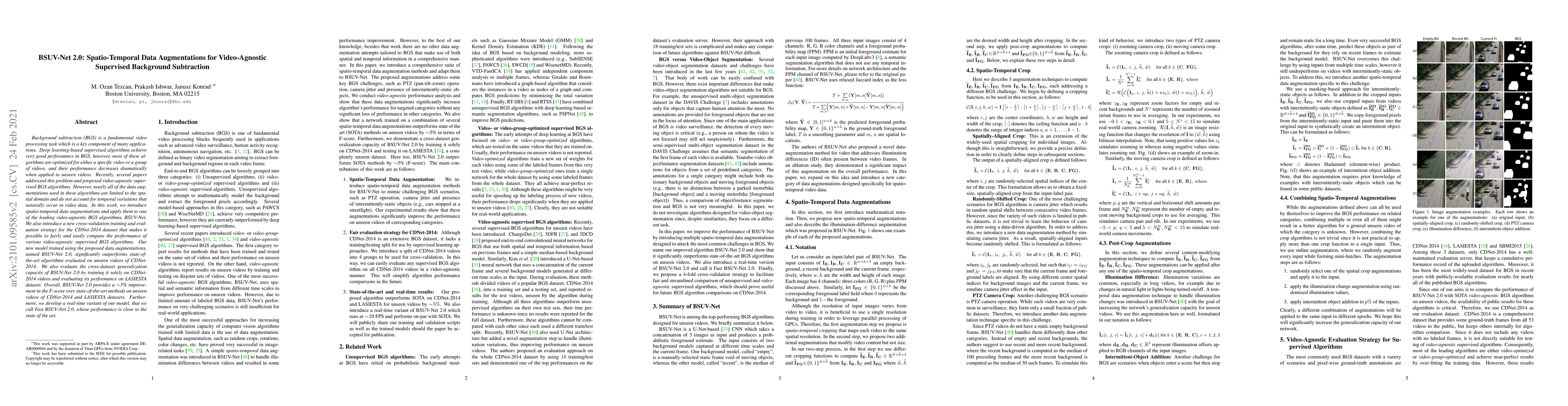 BSUV-Net 2.0 introduces spatio-temporal data augmentations to enhance video-agnostic supervised background subtraction, achieving a ~5% improvement in F-score over state-of-the-art methods on unseen datasets and demonstrating effective cross-dataset generalization.