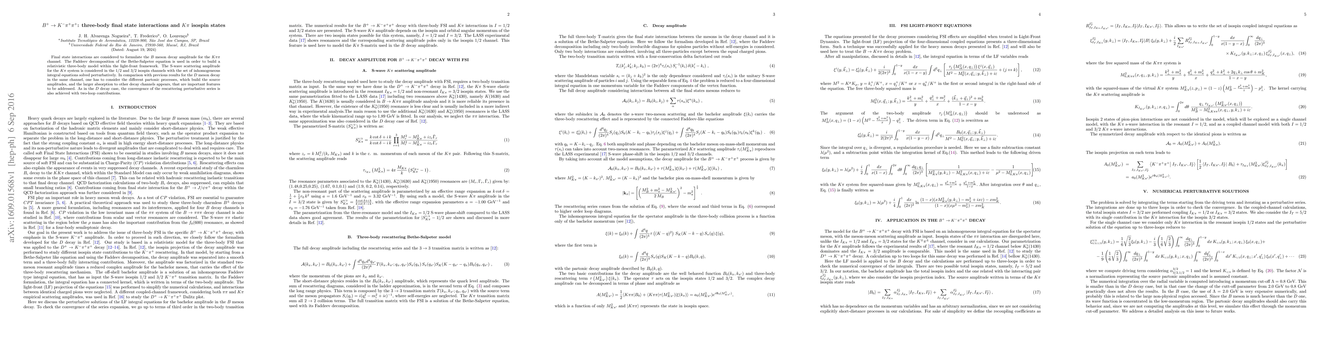 This paper investigates the $B^+\to K^-\pi^+\pi^+$ decay using a relativistic three-body model based on the Faddeev decomposition of the Bethe-Salpeter equation. It focuses on the $K\pi$ isospin states and final state interactions, achieving convergence in the perturbative series with two-loop contributions, similar to the $D$ meson decay.