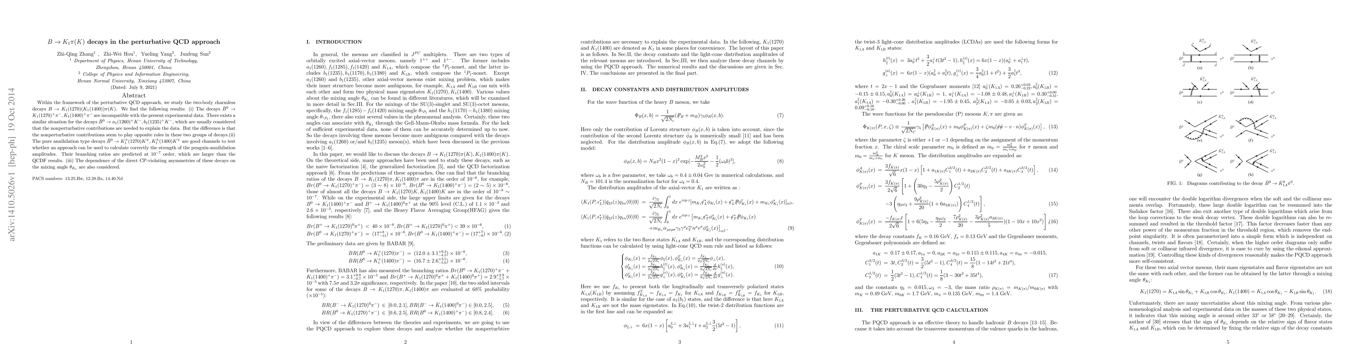 This paper investigates $B\to K_1\pi(K)$ decays using the perturbative QCD approach, finding that certain decay modes like $\bar B^0\to K_1(1270)^+\pi^-$ are incompatible with experimental data, suggesting nonperturbative contributions. It predicts the branching ratios of annihilation type decays at $10^{-7}$ order, larger than QCDF results, and examines the dependence of direct CP-violating asymmetries on the mixing angle $\theta_{K_1}$.