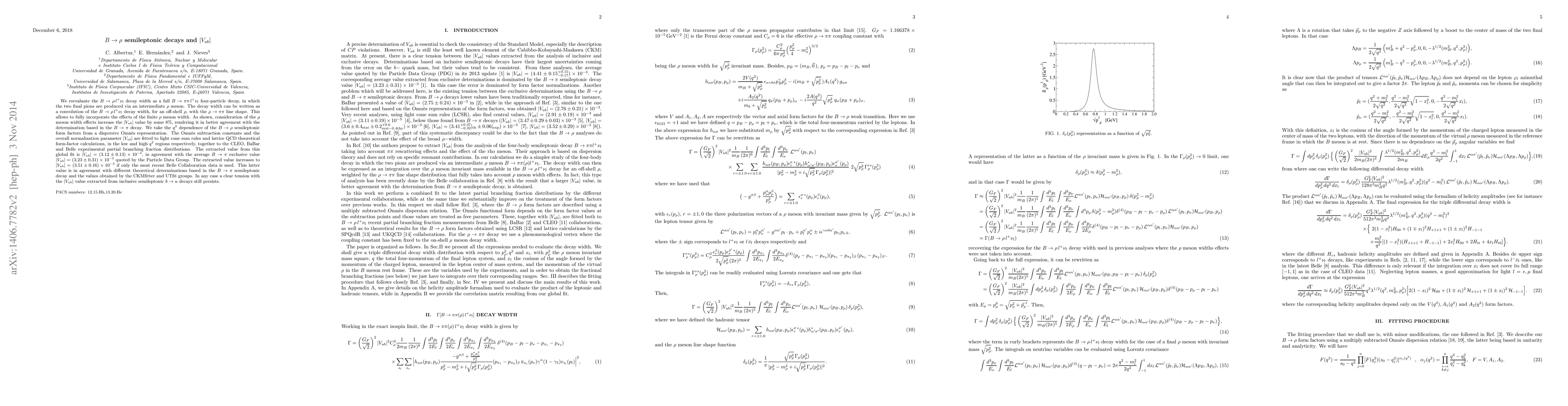 We reevaluate the $B\to\rho\,l^+\nu_l$ decay width as a full $B\to\pi\pi\,l^+\nu_l$ four-particle decay, in which the two final pions are produced via an intermediate $\rho$ meson. The decay width can be written as a convolution of the $B\to\rho\,l^+\nu_l$ decay width, for an off-shell $\rho$, with the $\rho\to\pi\pi$ line shape. This allows to fully incorporate the effects of the finite $\rho$ meson width. As shown, consideration of the $\rho$ meson width effects increase the $|V_{ub}|$ value by some 8%, rendering it in better agreement with the determination based in the $B\to\pi$ decay. We take the $q^2$ dependence of the $B\to \rho$ semileptonic form factors from a dispersive Omn\`es representation. The Omn\`es subtraction constants and the overall normalization parameter $|V_{ub}|$ are fitted to light cone sum rules and lattice QCD theoretical form-factor calculations, in the low and high $q^2$ regions respectively, together to the CLEO, BaBar and Belle experimental partial branching fraction distributions. The extracted value from this global fit is $|V_{ub}|=(3.12\pm 0.13)\times 10^{-3}$, in agreement with the average $B\to \pi$ exclusive value $|V_{ub}|=(3.23\pm 0.31)\times 10^{-3}$ quoted by the Particle Data Group. The extracted value increases to $|V_{ub}|=(3.51\pm 0.16)\times 10^{-3}$ if only the most recent Belle Collaboration data is used. This latter value is in agreement with different theoretical determinations based in the $B\to\pi$ semileptonic decay and the values obtained by the CKMfitter and UTfit groups. In any case a clear tension with the $|V_{ub}|$ value extracted from inclusive semileptonic $b\to u$ decays still persists.