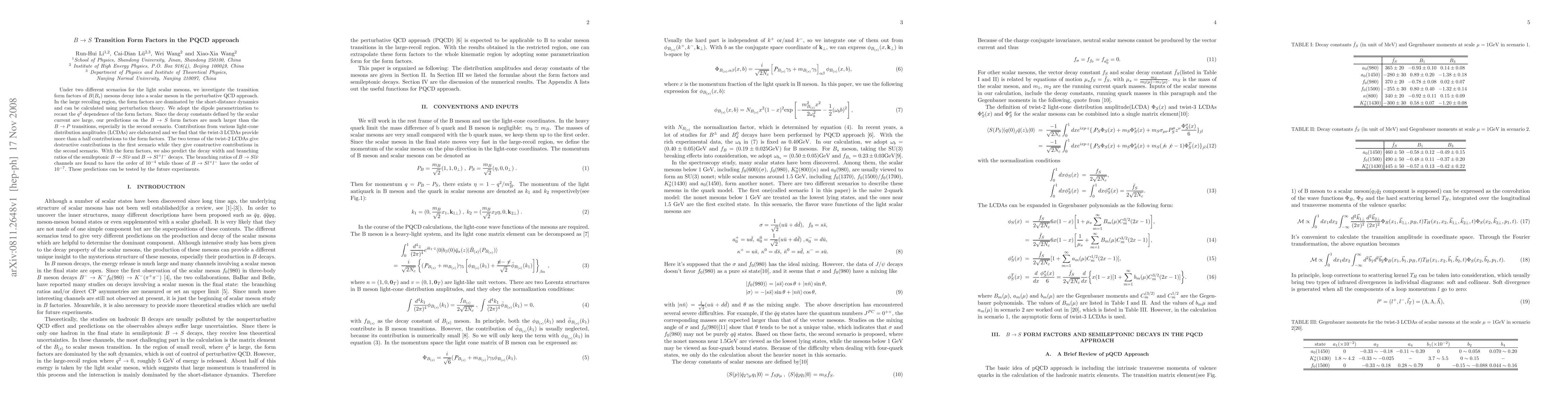 Under two different scenarios for the light scalar mesons, we investigate the transition form factors of $B(B_s)$ mesons decay into a scalar meson in the perturbative QCD approach. In the large recoiling region, the form factors are dominated by the short-distance dynamics and can be calculated using perturbation theory. We adopt the dipole parametrization to recast the $q^2$ dependence of the form factors. Since the decay constants defined by the scalar current are large, our predictions on the $B\to S$ form factors are much larger than the $B\to P$ transitions, especially in the second scenario. Contributions from various light-cone distribution amplitudes (LCDAs) are elaborated and we find that the twist-3 LCDAs provide more than a half contributions to the form factors. The two terms of the twist-2 LCDAs give destructive contributions in the first scenario while they give constructive contributions in the second scenario. With the form factors, we also predict the decay width and branching ratios of the semileptonic $B\to Sl\bar\nu$ and $B\to Sl^+l^-$ decays. The branching ratios of $B\to Sl\bar\nu$ channels are found to have the order of $10^{-4}$ while those of $B\to Sl^+l^-$ have the order of $10^{-7}$. These predictions can be tested by the future experiments.
