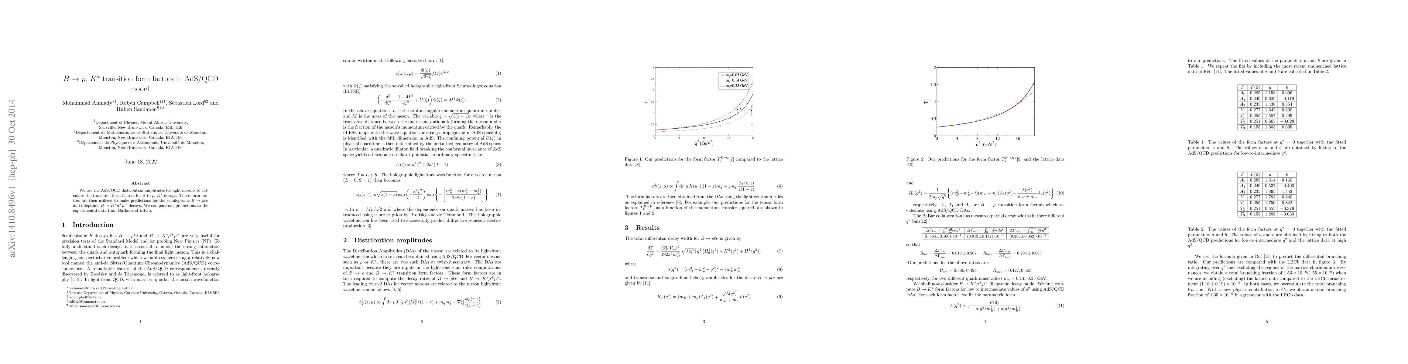 We use the AdS/QCD distribution amplitudes for light mesons to calculate the transition form factors for B to $\rho$, $K^*$ decays. These form factors are then utilized to make predictions for the semileptonic $B\to\rho\ell\nu$ and dileptonic $B\to K^* \mu^+\mu^-$ decays. We compare our predictions to the experimental data from BaBar and LHCb.