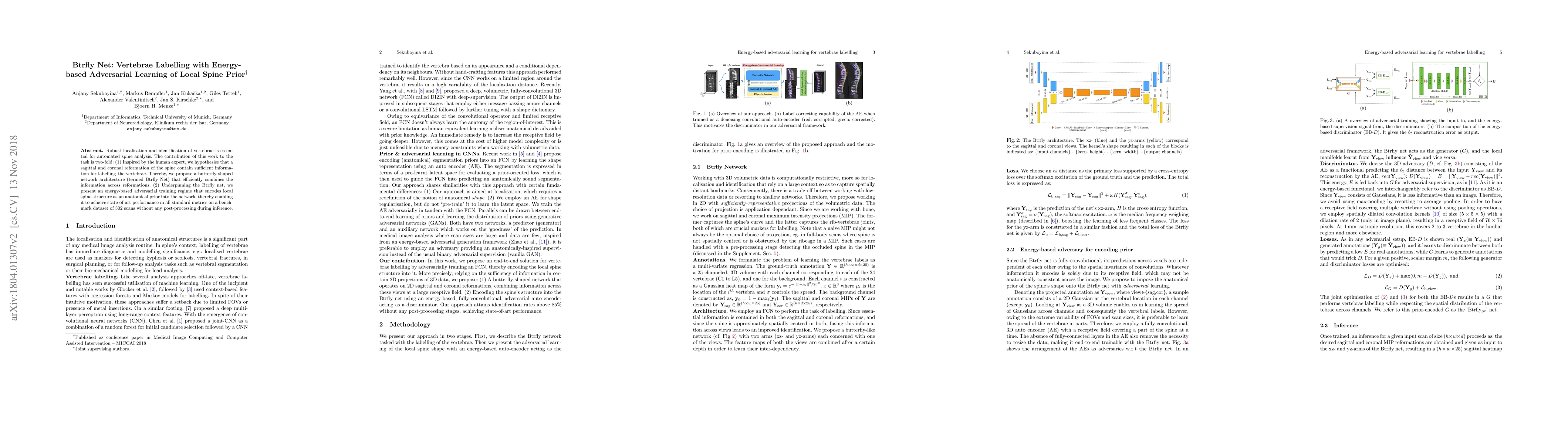This paper proposes Btrfly Net, a butterfly-shaped network architecture that leverages sagittal and coronal spine reformations for vertebrae labelling. It employs an energy-based adversarial training regime to encode local spine structure, achieving state-of-the-art performance on a benchmark dataset without post-processing.