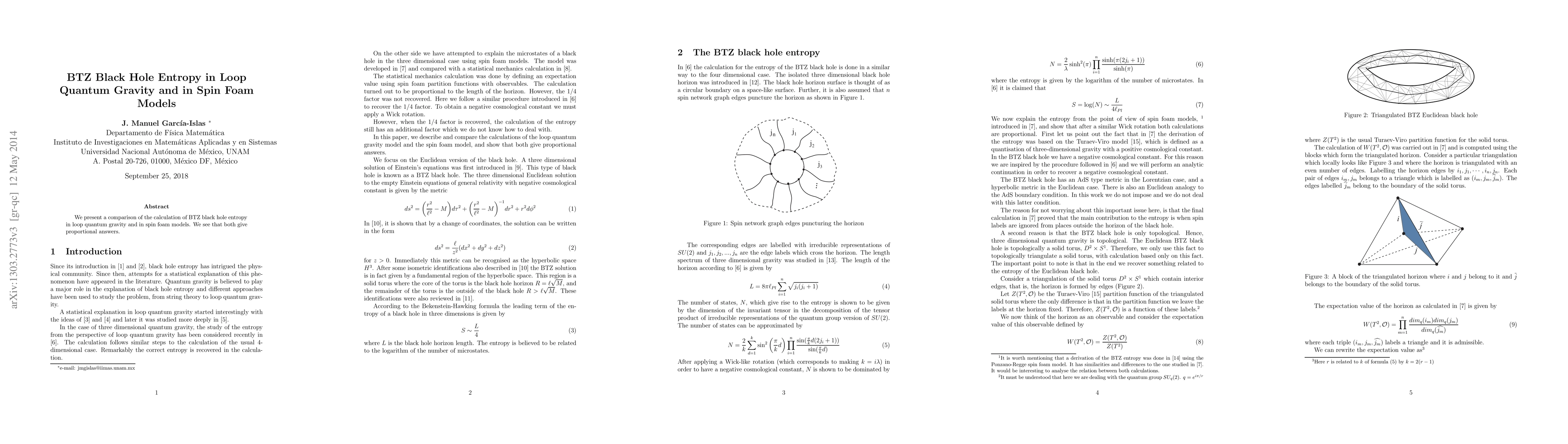 Summary: This paper compares BTZ black hole entropy calculations in loop quantum gravity and spin foam models, revealing that both approaches yield identical results.