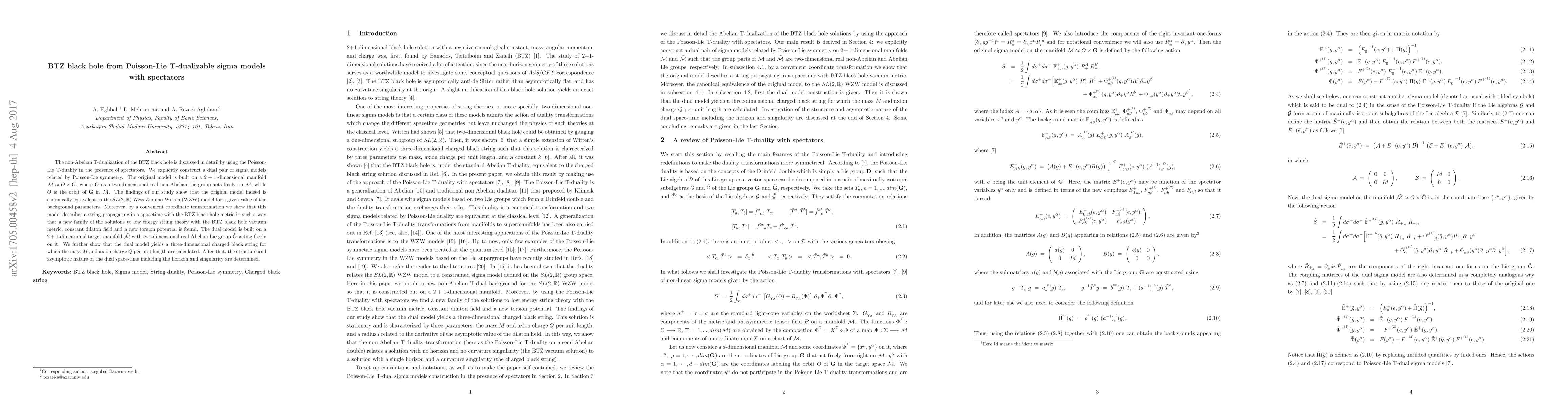 This paper explores the non-Abelian T-dualization of the BTZ black hole using Poisson-Lie T-duality, constructing a dual pair of sigma models. The original model is shown to be equivalent to the $SL(2,\mathbb{R})$ WZW model, describing a string in a BTZ black hole spacetime, while the dual model yields a three-dimensional charged black string with calculated mass and axion charge.
