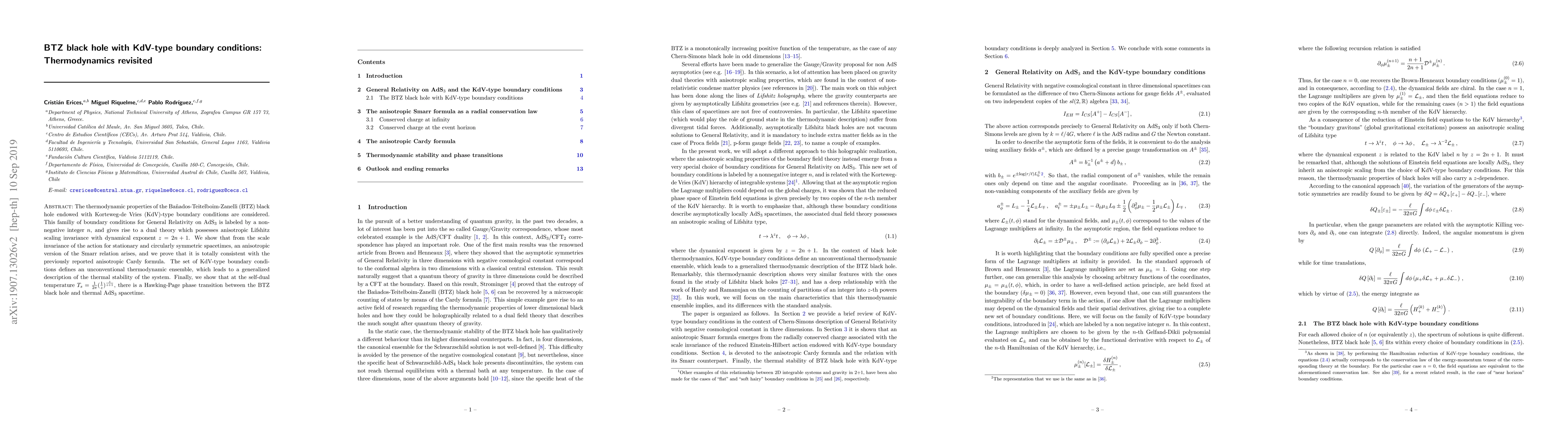 The paper presents a detailed derivation of an anisotropic Smarr relation and its consistency with the anisotropic Cardy formula for BTZ black holes under KdV-type boundary conditions, introducing a novel thermodynamic ensemble and identifying a Hawking-Page phase transition.