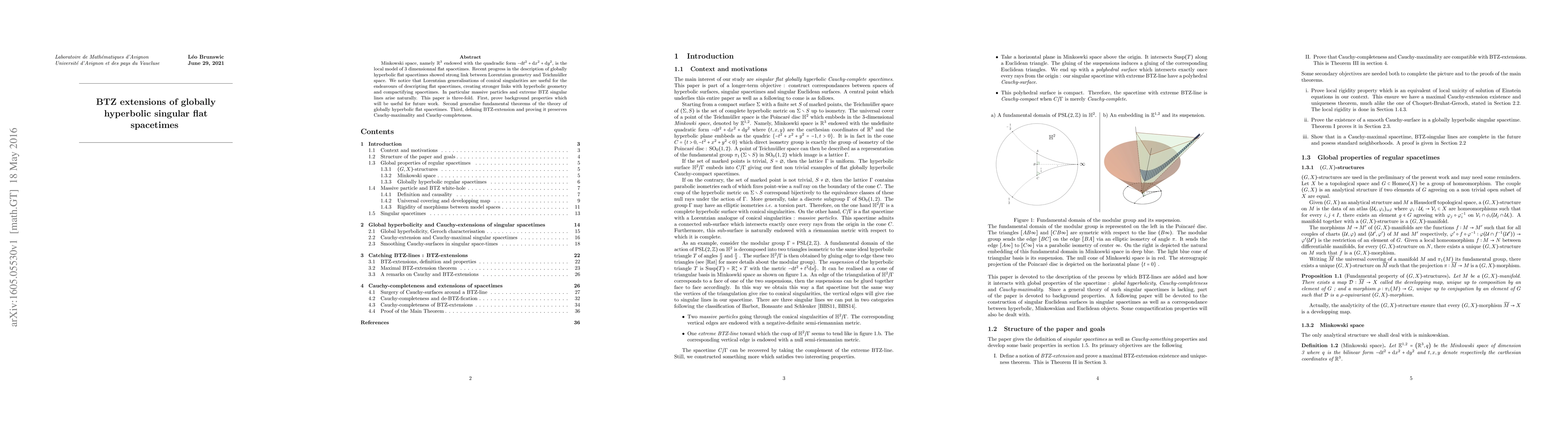 Minkowski space is the local model of 3 dimensionnal flat spacetimes. Recent progress in the description of globally hyperbolic flat spacetimes showed strong link between Lorentzian geometry and Teichm{\"u}ller space. We notice that Lorentzian generalisations of conical singularities are useful for the endeavours of descripting flat spacetimes, creating stronger links with hyperbolic geometry and compactifying spacetimes. In particular massive particles and extreme BTZ singular lines arise naturally. This paper is three-fold. First, prove background local properties which will be useful for future work. Second, generalise fundamental theorems of the theory of globally hyperbolic flat spacetimes. Third, defining BTZ-extension and proving it preserves Cauchy-maximality and Cauchy-completeness.
