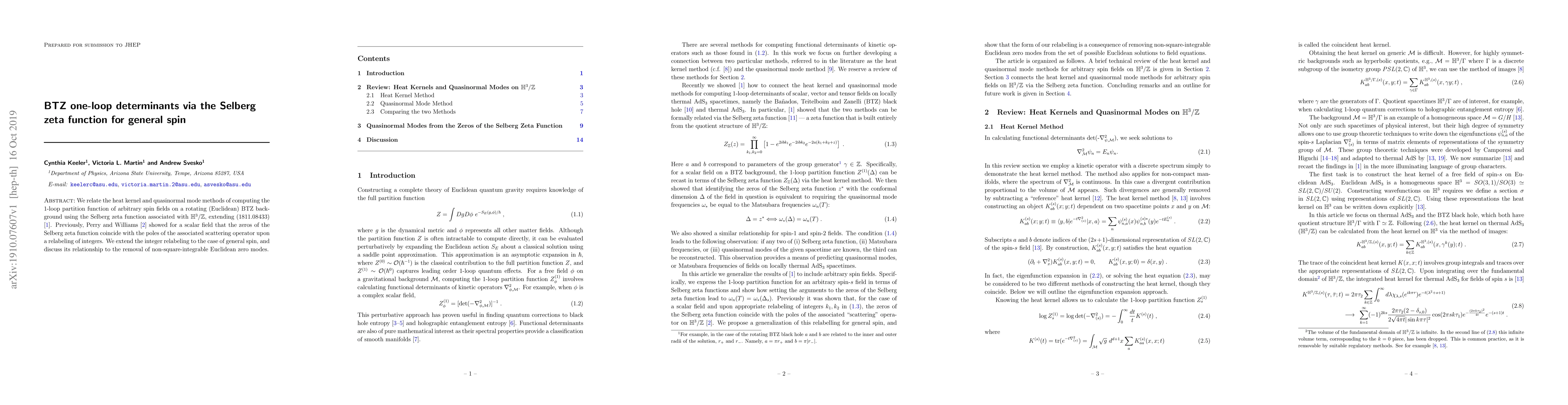We relate the heat kernel and quasinormal mode methods of computing the 1-loop partition function of arbitrary spin fields on a rotating (Euclidean) BTZ background using the Selberg zeta function associated with $\mathbb{H}^{3}/\mathbb{Z}$, extending (1811.08433). Previously, Perry and Williams showed for a scalar field that the zeros of the Selberg zeta function coincide with the poles of the associated scattering operator upon a relabeling of integers. We extend the integer relabeling to the case of general spin, and discuss its relationship to the removal of non-square-integrable Euclidean zero modes.