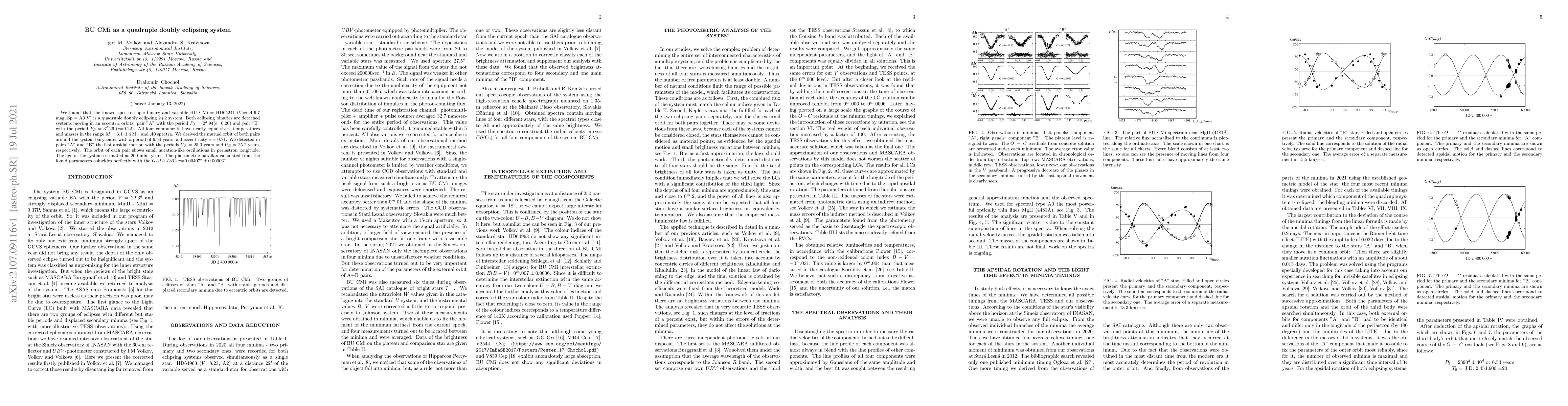 BU CMi is identified as a quadruple doubly eclipsing 2+2 system with two detached eclipsing binary pairs, "A" and "B," in eccentric orbits. The system's age is estimated at 200 million years, and its components exhibit fast apsidal motion and small nutation-like oscillations.