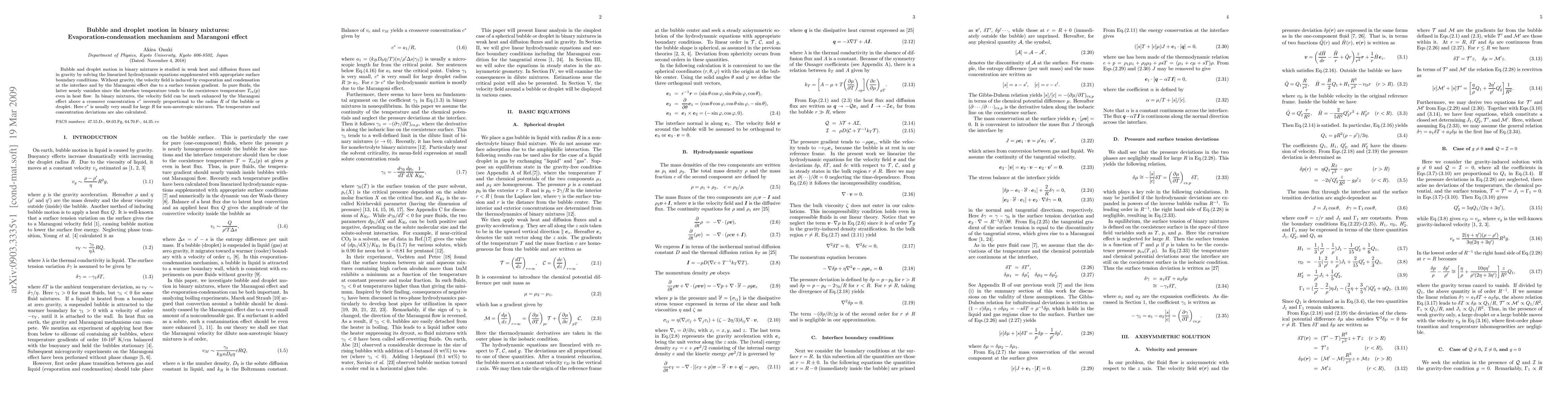 Bubble and droplet motion in binary mixtures is studied in weak heat and diffusion fluxes and in gravity by solving the linearized hydrodynamic equations supplemented with appropriate surface boundary conditions. Without gravity, the velocity field is induced by evaporation and condensation at the interface and by the Marangoni effect due to a surface tension gradient. In pure fluids, the latter nearly vanishes since the interface temperature tends to the coexistence temperature $T_{\rm cx}(p)$ even in heat flow. In binary mixtures, the velocity field can be much enhanced by the Marangoni effect above a crossover concentration $c^*$ inversely proportional to the radius $R$ of the bubble or droplet. Here $c^*$ is usually very small for large $R$ for non-azeotropic mixtures. The temperature and concentration deviations are also calculated.