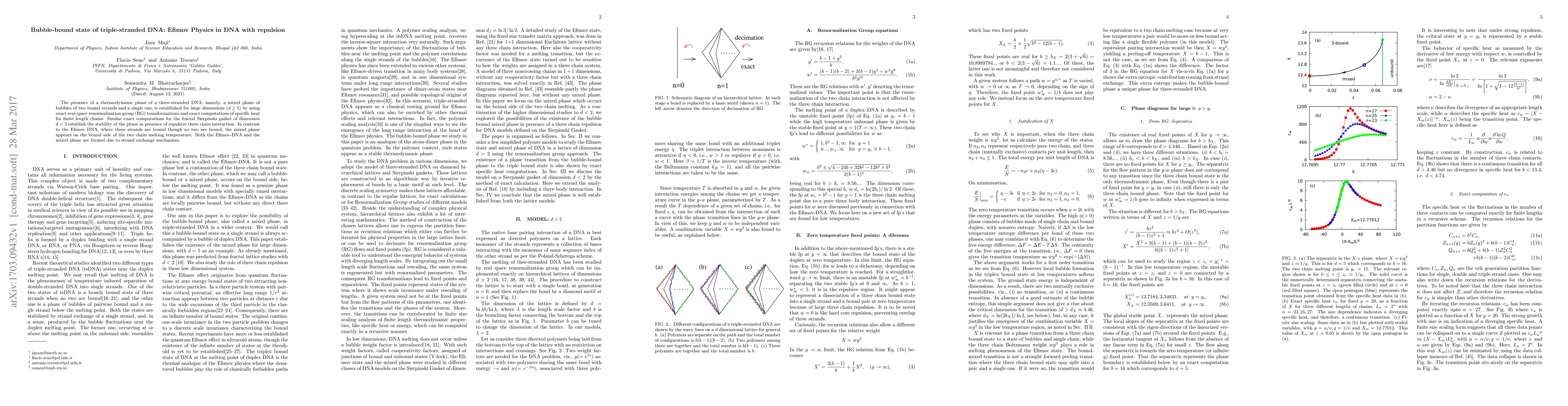 Researchers discovered a new phase of triple-stranded DNA where two strands form bubbles with a single strand, showing Efimov physics at high dimensions, and found it's stable in the presence of repulsive interactions.