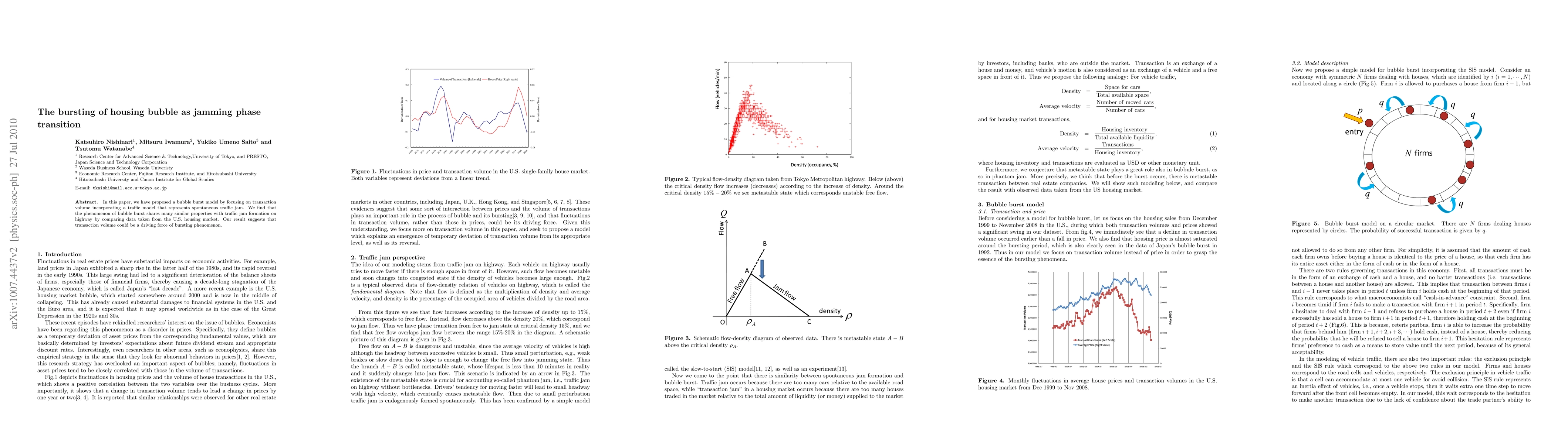 Researchers propose a bubble burst model that uses a traffic jam analogy to explain how market bubbles can collapse, finding similarities between transaction volumes and traffic congestion in the US housing market.