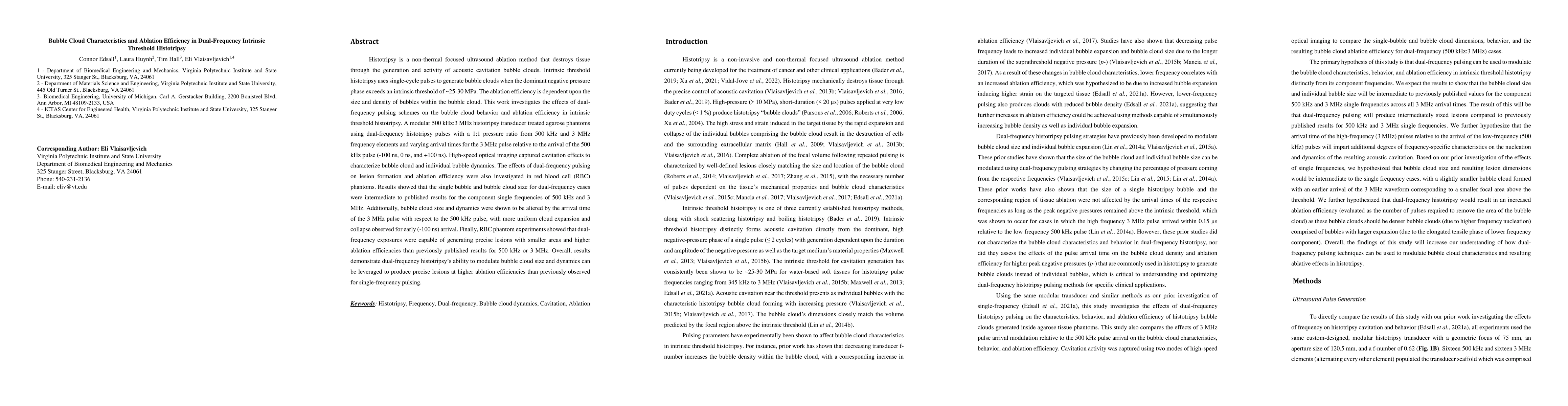 This paper investigates how dual-frequency pulsing in intrinsic threshold histotripsy affects bubble cloud characteristics and ablation efficiency. Results show that dual-frequency pulsing can modulate bubble cloud dynamics and improve ablation efficiency, generating precise lesions with higher efficiency than single-frequency methods.
