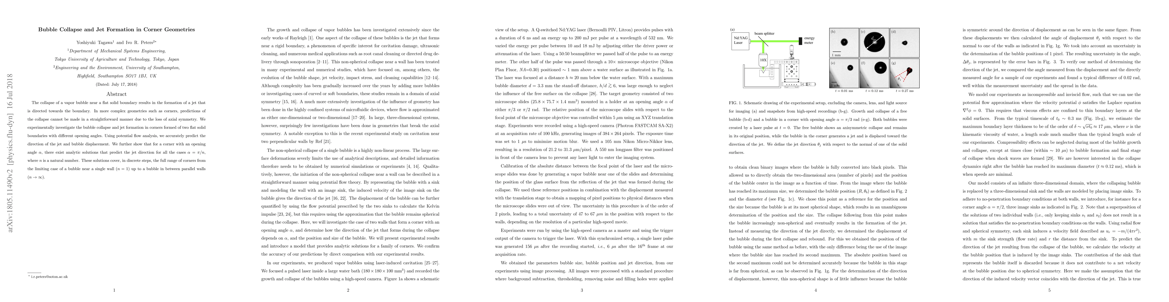 Researchers investigated bubble collapse and jet formation in corners with different opening angles using potential flow analysis, accurately predicting jet direction and bubble displacement. They found analytic solutions for certain corner angles that cover a range of cases from a single wall to parallel walls.