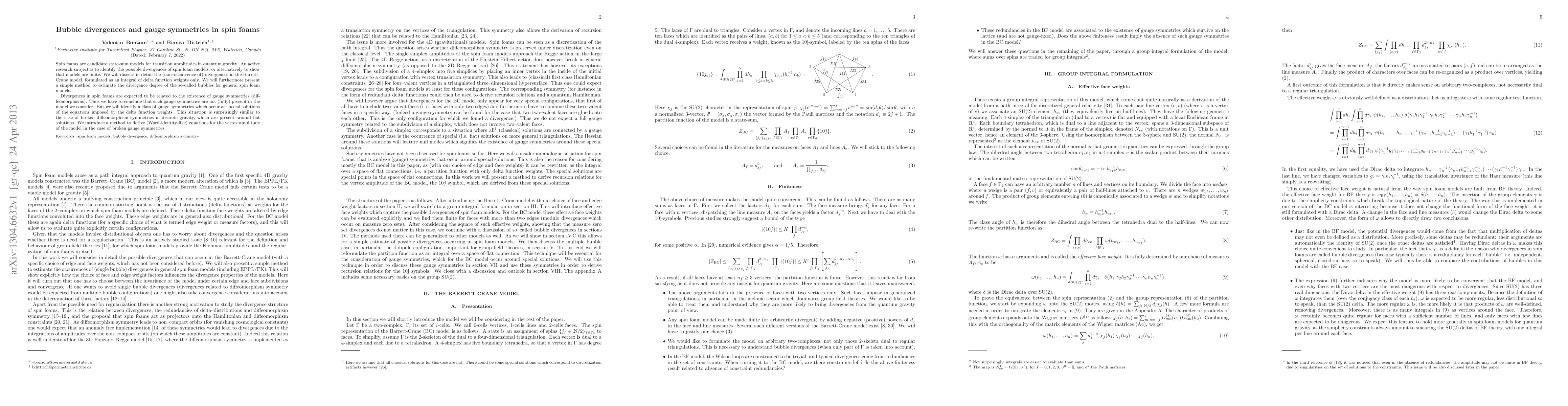 Spin foams are candidate state-sum models for transition amplitudes in quantum gravity. An active research subject is to identify the possible divergences of spin foam models, or alternatively to show that models are finite. We will discuss in detail the (non--occurrence of) divergences in the Barrett-Crane model, formulated as an integral of delta function weights only. We will furthermore present a simple method to estimate the divergence degree of the so-called bubbles for general spin foam models. Divergences in spin foams are expected to be related to the existence of gauge symmetries (diffeomorphisms). Thus we have to conclude that such gauge symmetries are not (fully) present in the model we consider. But we will identify a class of gauge symmetries which occur at special solutions of the equations imposed by the delta function weights. This situation is surprisingly similar to the case of broken diffeomorphism symmetries in discrete gravity, which are present around flat solutions. We introduce a method to derive (Ward-identity-like) equations for the vertex amplitude of the model in the case of broken gauge symmetries.
