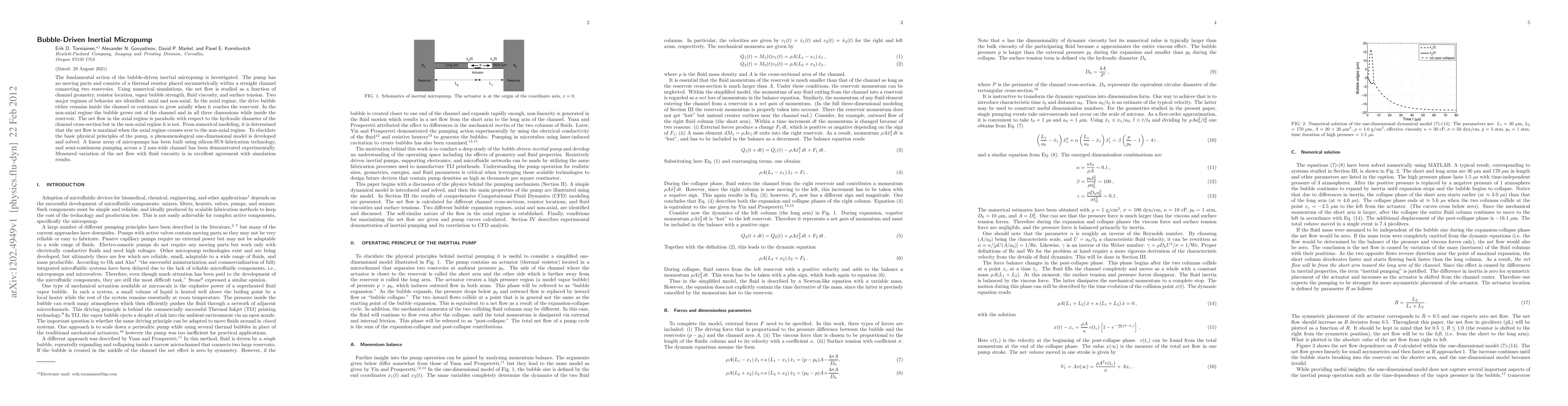 The fundamental action of the bubble-driven inertial micropump is investigated. The pump has no moving parts and consists of a thermal resistor placed asymmetrically within a straight channel connecting two reservoirs. Using numerical simulations, the net flow is studied as a function of channel geometry, resistor location, vapor bubble strength, fluid viscosity, and surface tension. Two major regimes of behavior are identified: axial and non-axial. In the axial regime, the drive bubble either remains inside the channel or continues to grow axially when it reaches the reservoir. In the non-axial regime the bubble grows out of the channel and in all three dimensions while inside the reservoir. The net flow in the axial regime is parabolic with respect to the hydraulic diameter of the channel cross-section but in the non-axial regime it is not. From numerical modeling, it is determined that the net flow is maximal when the axial regime crosses over to the non-axial regime. To elucidate the basic physical principles of the pump, a phenomenological one-dimensional model is developed and solved. A linear array of micropumps has been built using silicon-SU8 fabrication technology, and semi-continuous pumping across a 2 mm-wide channel has been demonstrated experimentally. Measured variation of the net flow with fluid viscosity is in excellent agreement with simulation results.