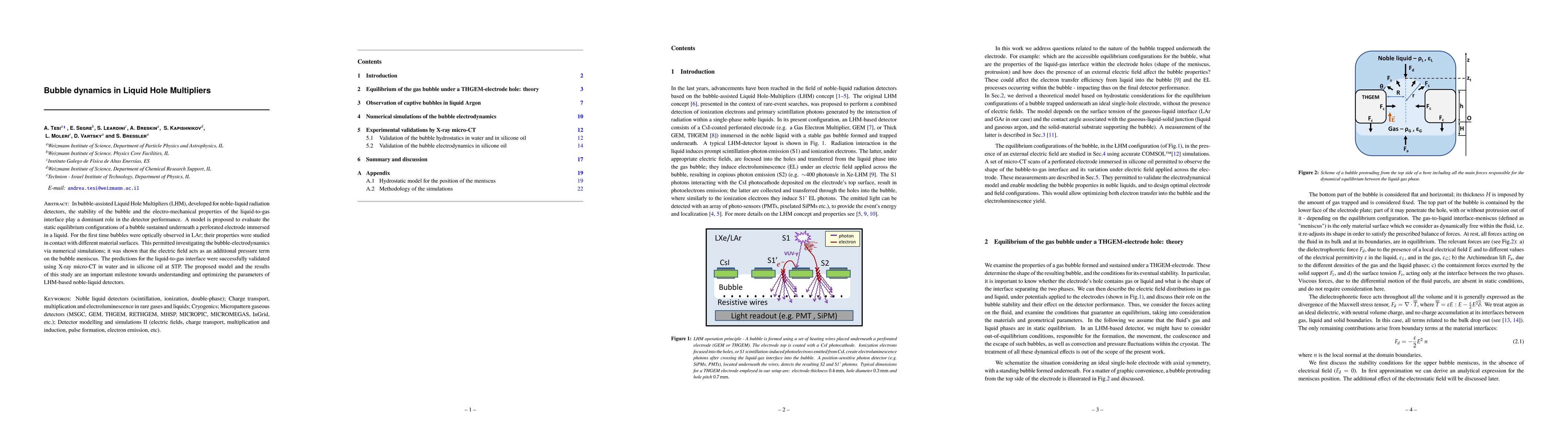This paper proposes a model to evaluate the static equilibrium of bubbles in Liquid Hole Multipliers (LHM), crucial for noble-liquid radiation detectors, and validates it using X-ray micro-CT. The study reveals the electro-mechanical properties of the liquid-to-gas interface and demonstrates the electric field's role in bubble dynamics through numerical simulations.