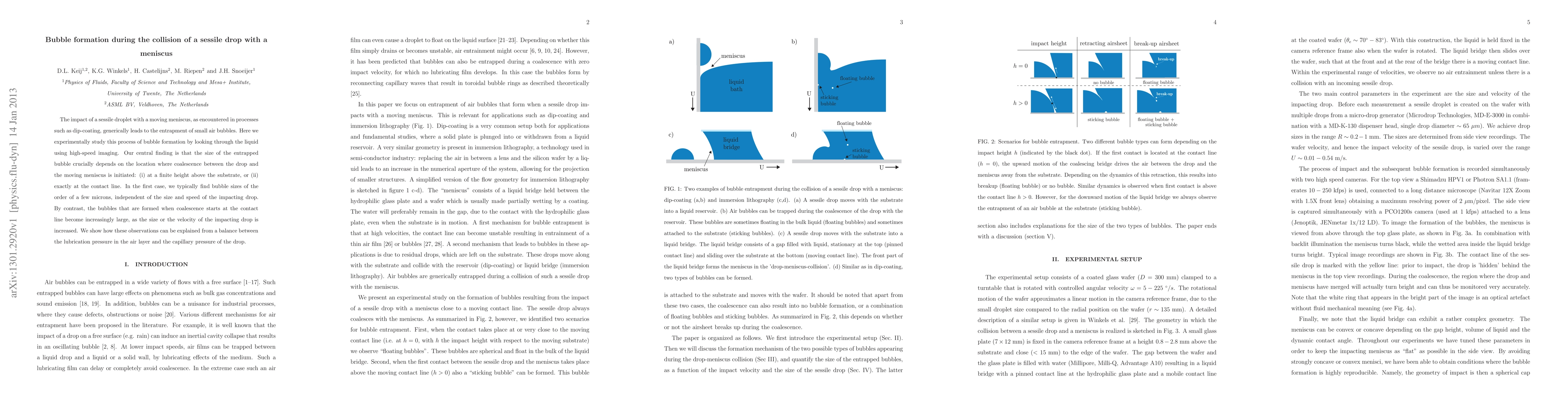 The impact of a sessile droplet with a moving meniscus, as encountered in processes such as dip-coating, generically leads to the entrapment of small air bubbles. Here we experimentally study this process of bubble formation by looking through the liquid using high-speed imaging. Our central finding is that the size of the entrapped bubble crucially depends on the location where coalescence between the drop and the moving meniscus is initiated: (i) at a finite height above the substrate, or (ii) exactly at the contact line. In the first case, we typically find bubble sizes of the order of a few microns, independent of the size and speed of the impacting drop. By contrast, the bubbles that are formed when coalescence starts at the contact line become increasingly large, as the size or the velocity of the impacting drop is increased. We show how these observations can be explained from a balance between the lubrication pressure in the air layer and the capillary pressure of the drop.
