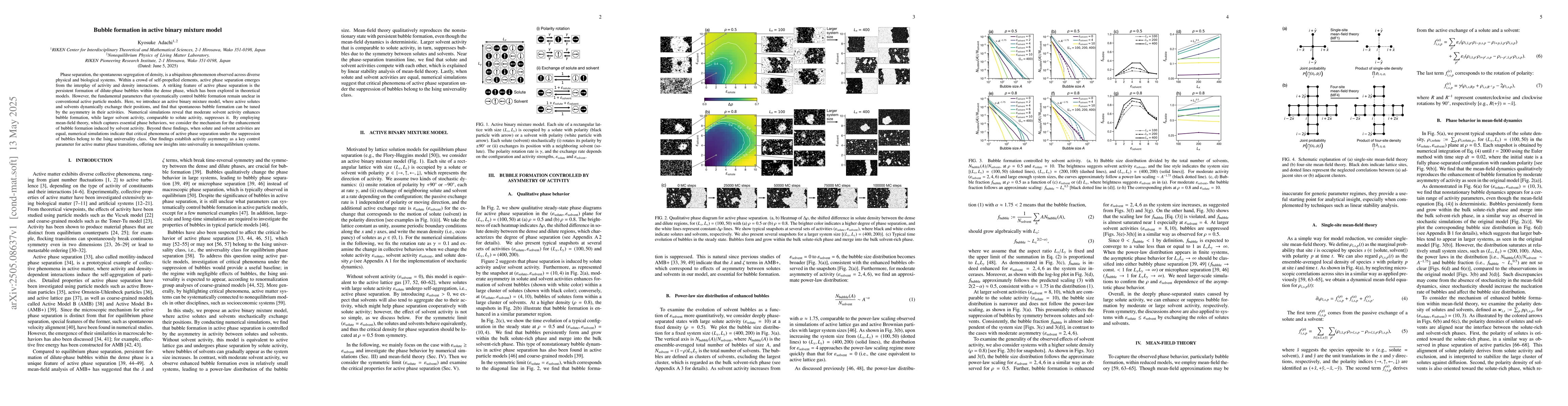 Development of an active binary mixture model that explains bubble formation in active phase separation through activity asymmetry, supported by numerical simulations and mean-field theory.