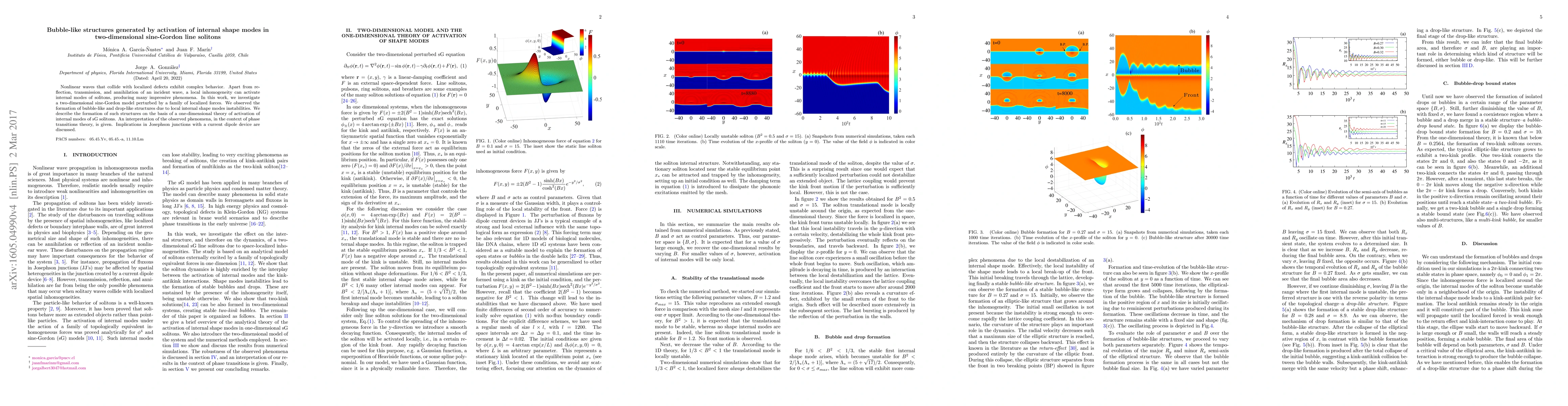 Nonlinear waves that collide with localized defects exhibit complex behavior. Apart from reflection, transmission, and annihilation of an incident wave, a local inhomogeneity can activate internal modes of solitons, producing many impressive phenomena. In this work, we investigate a two-dimensional sine-Gordon model perturbed by a family of localized forces. We observed the formation of bubble-like and drop-like structures due to local internal shape modes instabilities. We describe the formation of such structures on the basis of a one-dimensional theory of activation of internal modes of sG solitons. An interpretation of the observed phenomena, in the context of phase transitions theory, is given. Implications in Josephson junctions with a current dipole device are discussed.