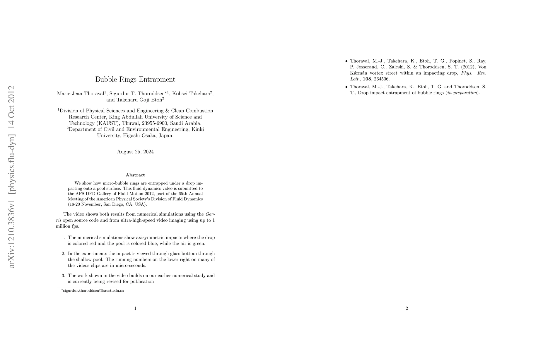 This study demonstrates the entrapment of micro-bubble rings beneath a drop impacting a pool surface, showcasing the intricate fluid dynamics involved. The findings were presented at the 2012 APS DFD Gallery of Fluid Motion during the American Physical Society's Division of Fluid Dynamics Annual Meeting.