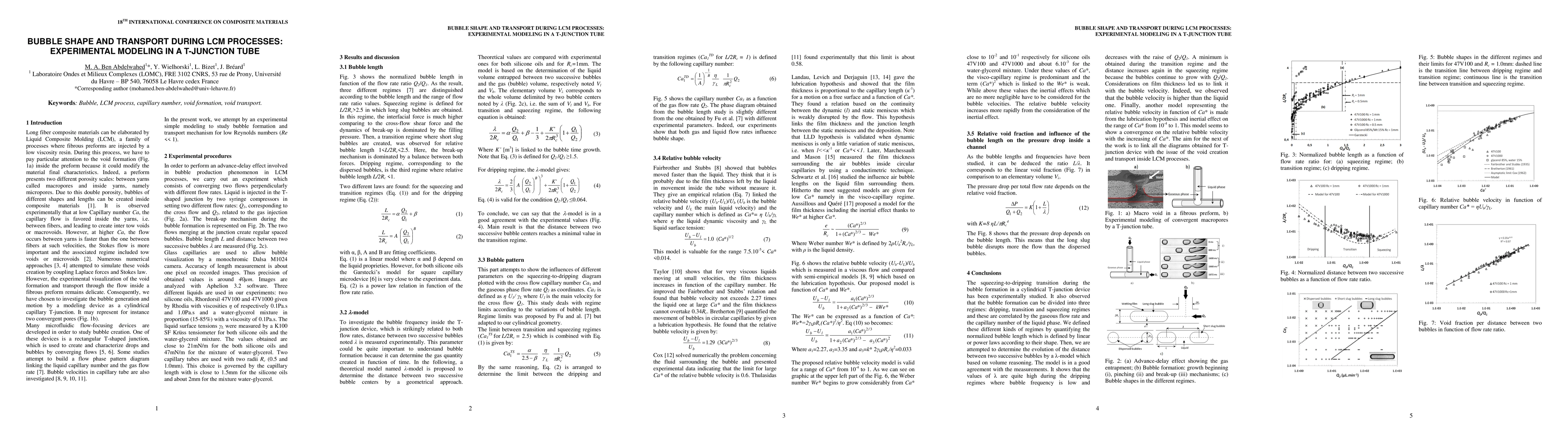 This study experimentally investigates the bubble shape and transport dynamics during Liquid Composite Molding (LCM) processes in a T-junction tube, focusing on the formation of voids within fibrous preforms that can affect the final composite material properties due to macropores and micropores. The research aims to understand the mechanisms influencing void formation to improve composite material quality.