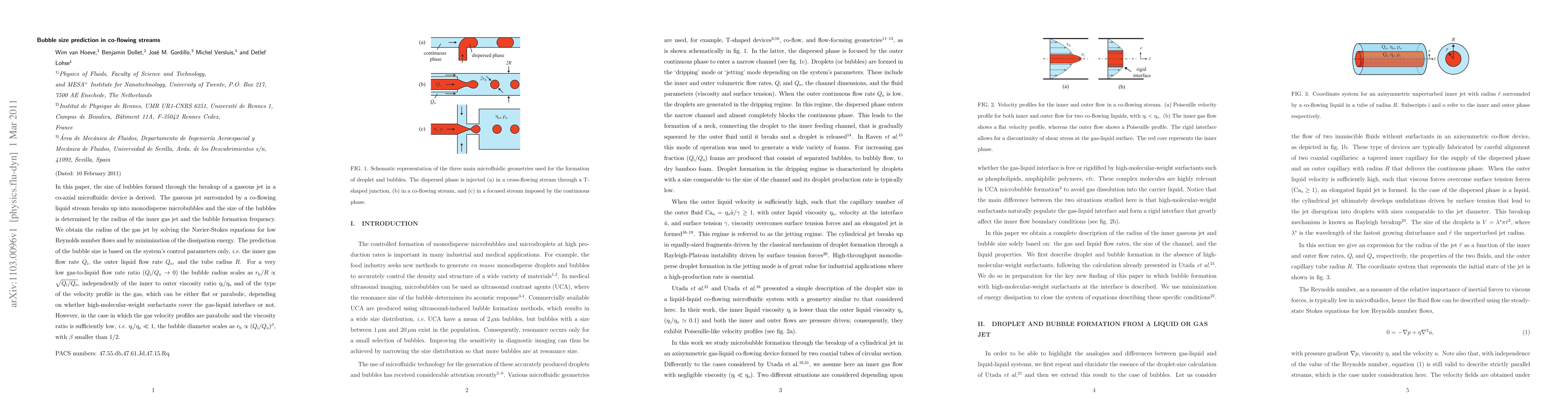 In this paper, the size of bubbles formed through the breakup of a gaseous jet in a co-axial microfluidic device is derived. The gaseous jet surrounded by a co-flowing liquid stream breaks up into monodisperse microbubbles and the size of the bubbles is determined by the radius of the inner gas jet and the bubble formation frequency. We obtain the radius of the gas jet by solving the Navier-Stokes equations for low Reynolds number flows and by minimization of the dissipation energy. The prediction of the bubble size is based on the system's control parameters only, i.e. the inner gas flow rate $Q_i$, the outer liquid flow rate $Q_o$, and the tube radius $R$. For a very low gas-to-liquid flow rate ratio ($Q_i / Q_o \rightarrow 0$) the bubble radius scales as $r_b / R \propto \sqrt{Q_i / Q_o}$, independently of the inner to outer viscosity ratio $\eta_i/\eta_o$ and of the type of the velocity profile in the gas, which can be either flat or parabolic, depending on whether high-molecular-weight surfactants cover the gas-liquid interface or not. However, in the case in which the gas velocity profiles are parabolic and the viscosity ratio is sufficiently low, i.e. $\eta_i/\eta_o \ll 1$, the bubble diameter scales as $r_b \propto (Q_i/Q_o)^\beta$, with $\beta$ smaller than 1/2.