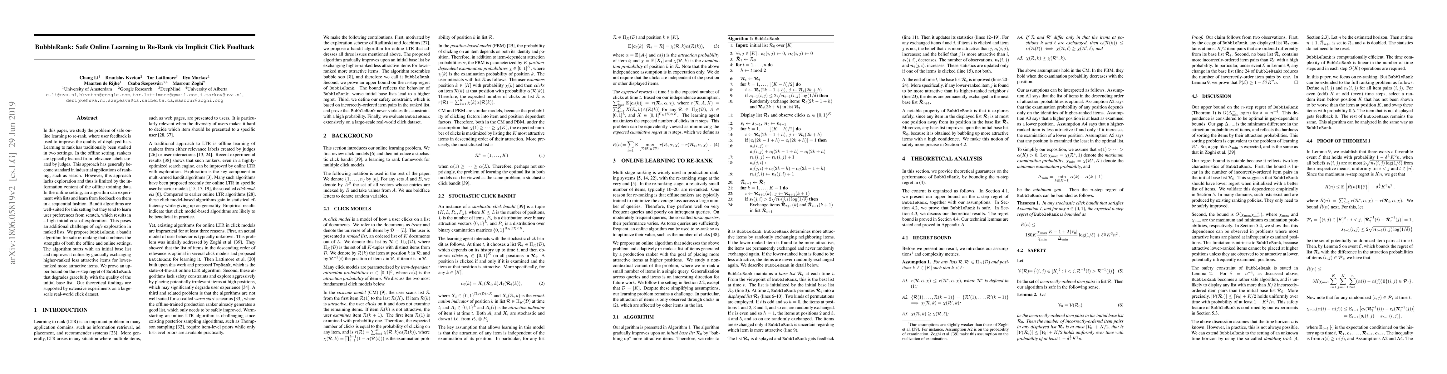 BubbleRank is a novel bandit algorithm designed for safe online learning to re-rank, leveraging implicit click feedback to improve list quality. It combines offline and online learning strengths, starting with an initial base list and gradually optimizing it through exploration, while ensuring safe exploration and minimizing initial costs.