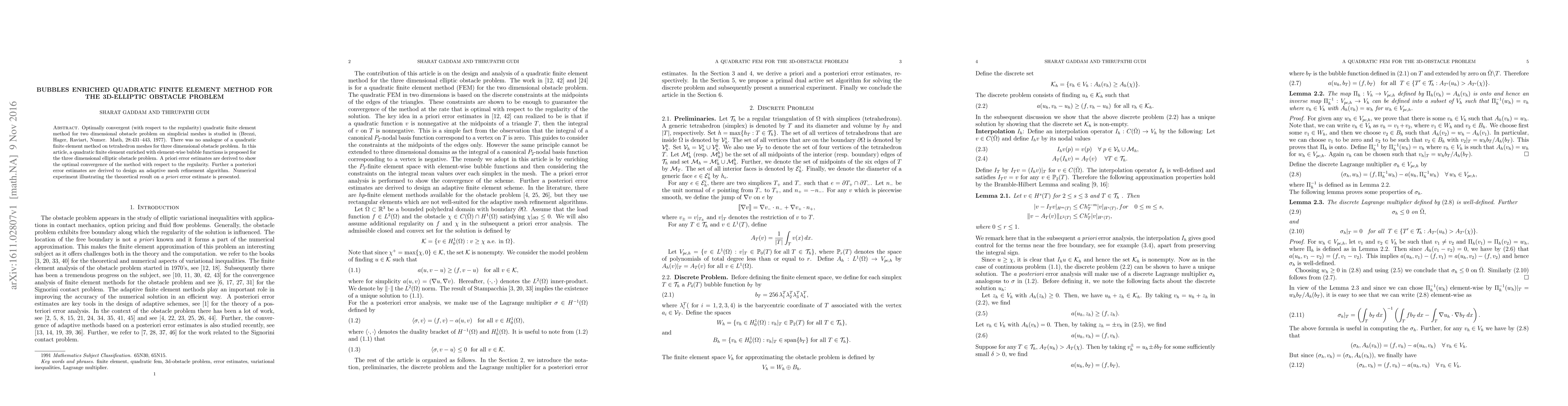 This paper proposes a quadratic finite element method enriched with bubble functions for solving the 3D elliptic obstacle problem on tetrahedron meshes. The method achieves optimal convergence and includes a posteriori error estimates to guide adaptive mesh refinement, supported by numerical experiments.