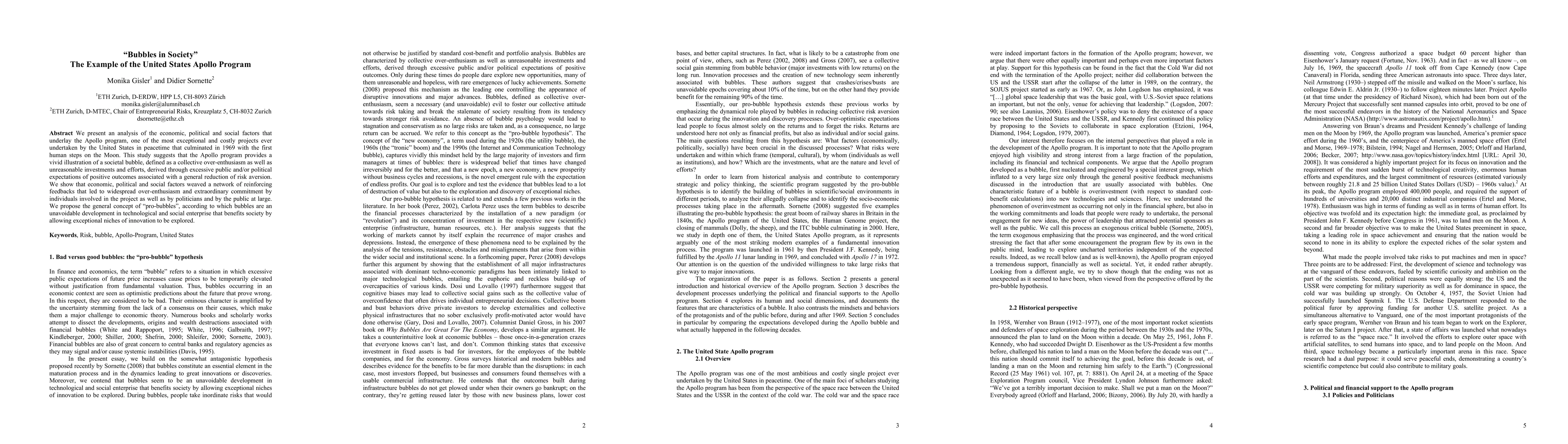 We present an analysis of the economic, political and social factors that underlay the Apollo program, one of the most exceptional and costly projects ever undertaken by the United States in peacetime that culminated in 1969 with the first human steps on the Moon. This study suggests that the Apollo program provides a vivid illustration of a societal bubble, defined as a collective over-enthusiasm as well as unreasonable investments and efforts, derived through excessive public and/or political expectations of positive outcomes associated with a general reduction of risk aversion. We show that economic, political and social factors weaved a network of reinforcing feedbacks that led to widespread over-enthusiasm and extraordinary commitment by individuals involved in the project as well as by politicians and by the public at large. We propose the general concept of ``pro-bubbles,'' according to which bubbles are an unavoidable development in technological and social enterprise that benefits society by allowing exceptional niches of innovation to be explored.