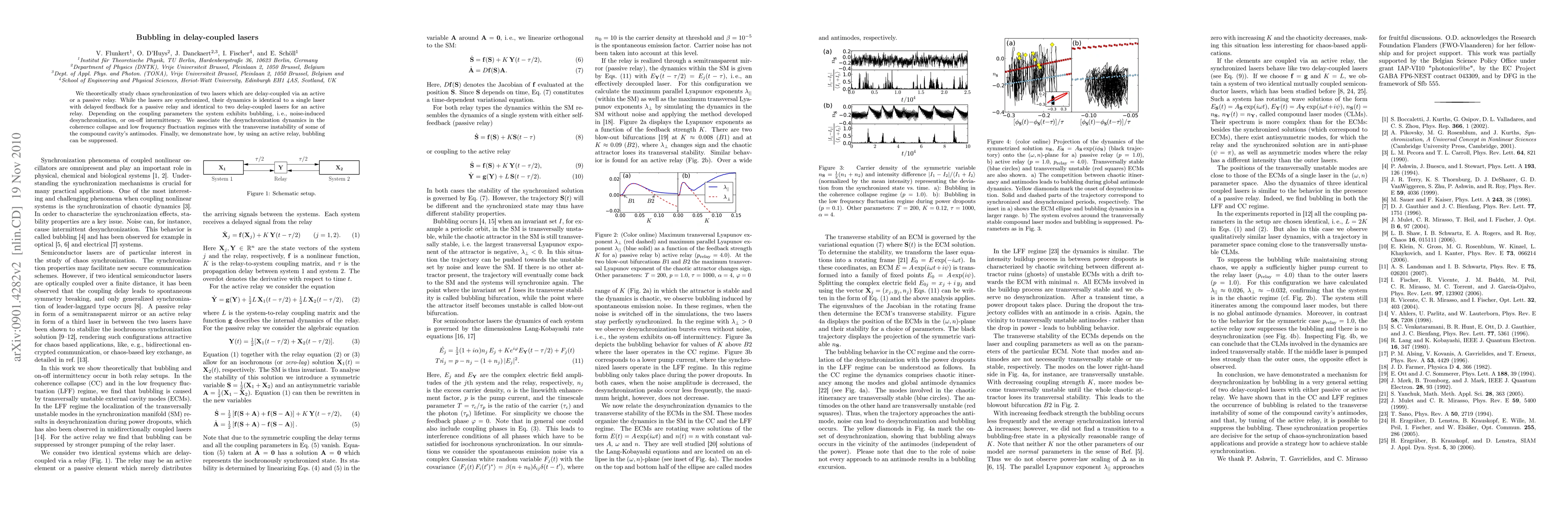 This paper investigates chaos synchronization in delay-coupled lasers, showing that bubbling (noise-induced desynchronization) can occur depending on coupling parameters. An active relay can suppress bubbling, while passive relay dynamics resemble a single laser with delayed feedback.