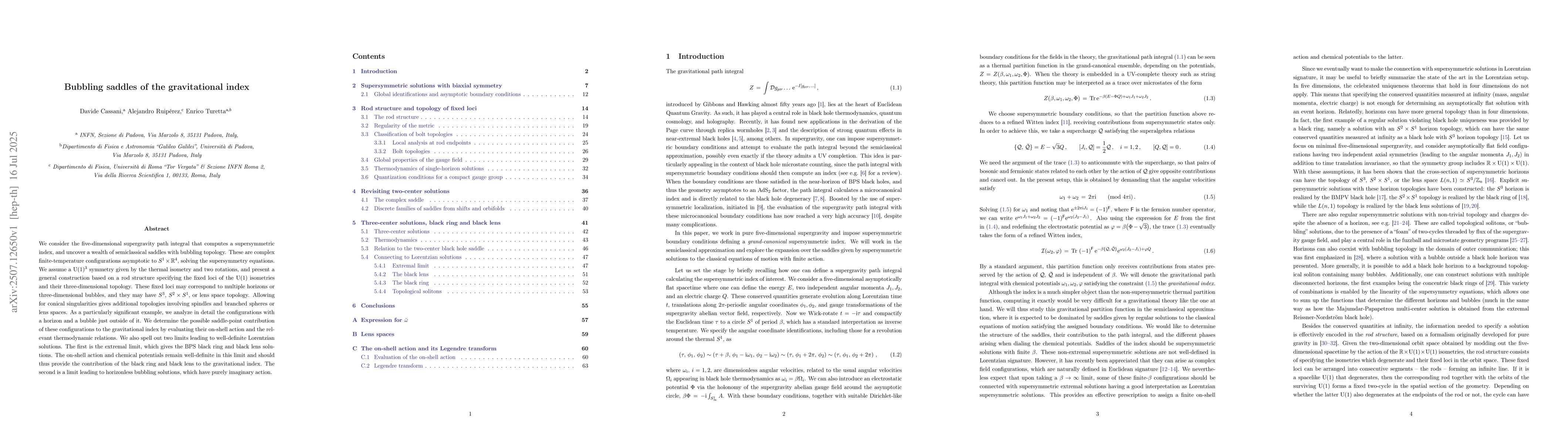 We consider the five-dimensional supergravity path integral that computes a supersymmetric index, and uncover a wealth of semiclassical saddles with bubbling topology. These are complex finite-temperature configurations asymptotic to $S^1\times\mathbb{R}^4$, solving the supersymmetry equations. We assume a ${\rm U}(1)^3$ symmetry given by the thermal isometry and two rotations, and present a general construction based on a rod structure specifying the fixed loci of the ${\rm U}(1)$ isometries and their three-dimensional topology. These fixed loci may correspond to multiple horizons or three-dimensional bubbles, and they may have $S^3$, $S^2\times S^1$, or lens space topology. Allowing for conical singularities gives additional topologies involving spindles and branched spheres or lens spaces. As a particularly significant example, we analyze in detail the configurations with a horizon and a bubble just outside of it. We determine the possible saddle-point contribution of these configurations to the gravitational index by evaluating their on-shell action and the relevant thermodynamic relations. We also spell out two limits leading to well-definite Lorentzian solutions. The first is the extremal limit, which gives the BPS black ring and black lens solutions. The on-shell action and chemical potentials remain well-definite in this limit and should thus provide the contribution of the black ring and black lens to the gravitational index. The second is a limit leading to horizonless bubbling solutions, which have purely imaginary action.