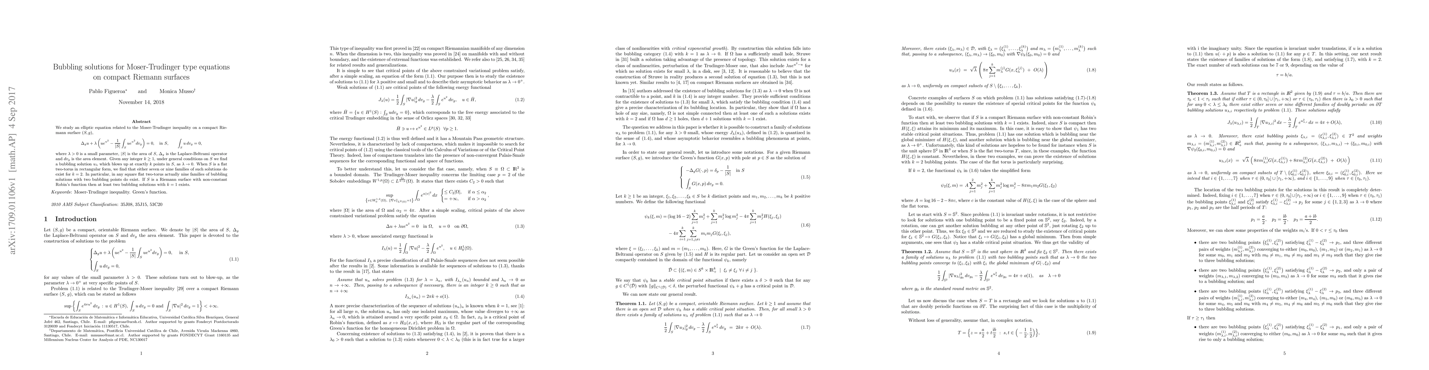 We study an elliptic equation related to the Moser-Trudinger inequality on a compact Riemann surface $(S,g)$, $$ \Delta_g u+\lambda \Biggl(ue^{u^2}-{1\over |S|} \int_S ue^{u^2} dv_g\Biggl)=0,\quad\text{in $S$},\qquad \int_S u\,dv_g=0, $$ where $\lambda>0$ is a small parameter, $|S|$ is the area of $S$, $\Delta_g$ is the Laplace-Beltrami operator and $dv_g$ is the area element. Given any integer $k\geq 1$, under general conditions on $S$ we find a bubbling solution $u_\lambda$ which blows up at exactly $k$ points in $S$, as $\lambda \to0$. When $S$ is a flat two-torus in rectangular form, we find that either seven or nine families of such solutions do exist for $k=2$. In particular, in any square flat two-torus actually nine families of bubbling solutions with two bubbling points do exist. If $S$ is a Riemann surface with non-constant Robin's function then at least two bubbling solutions with $k=1$ exists.