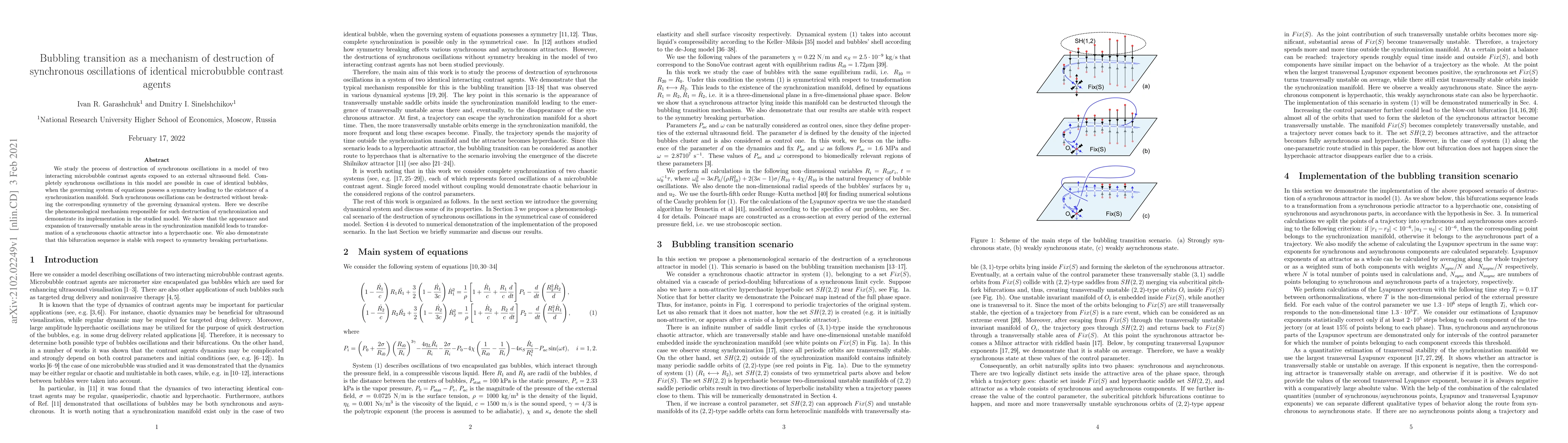 This paper investigates the destruction of synchronous oscillations in identical microbubble contrast agents under ultrasound, revealing that bubbling transitions cause the breakdown of synchronization without altering the system's symmetry. The study demonstrates how unstable areas in the synchronization manifold lead to a transformation from synchronous chaos to hyperchaos, showing stability against symmetry breaking perturbations.