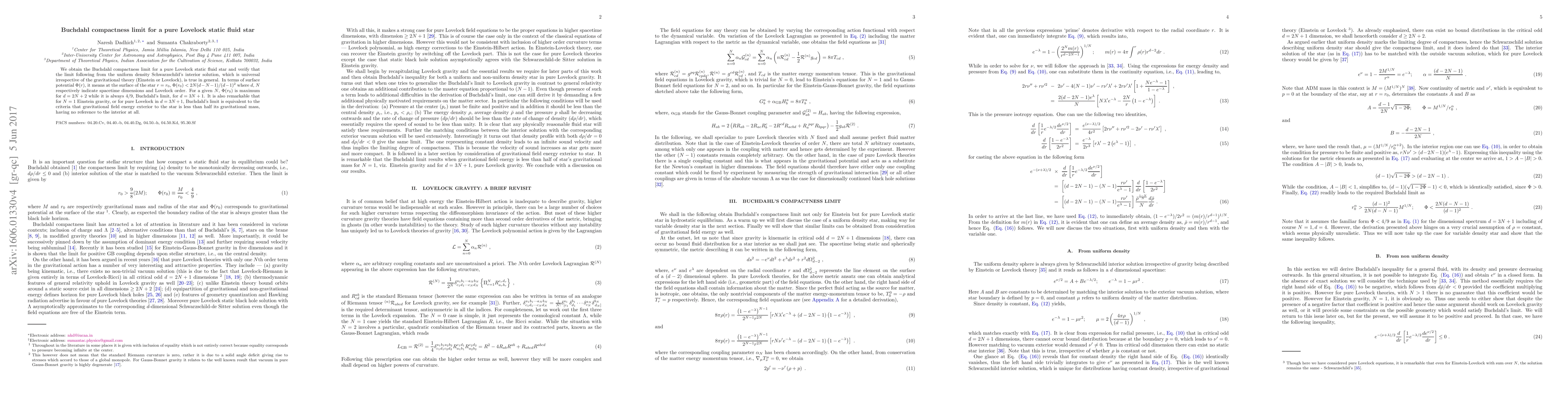 The paper calculates Buchdahl compactness limit for a pure Lovelock static fluid star, verifying a universal limit that holds true regardless of gravitational theory, and finds specific limits for certain spacetime dimensions and order.