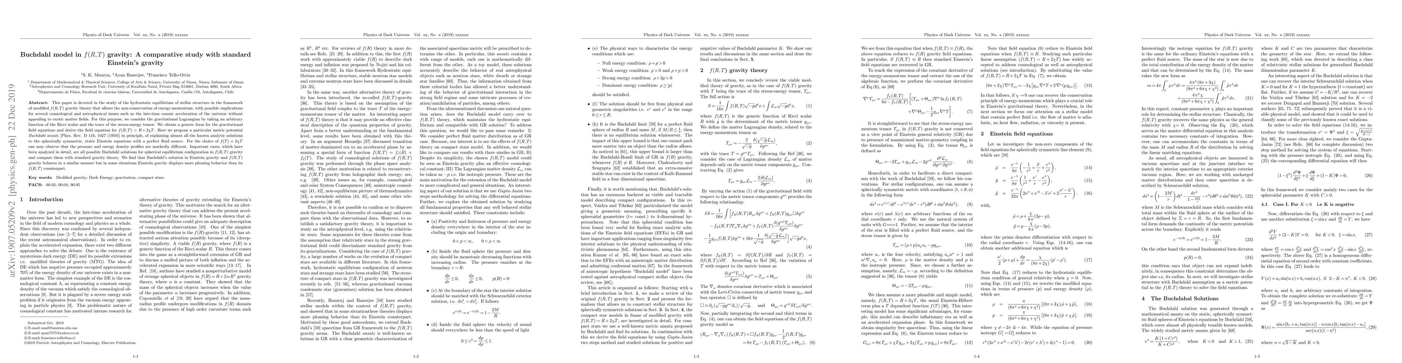 This study compares stellar structure in f(R,T) gravity to Einstein's gravity, finding that Buchdahl solutions behave similarly but with some differences in behavior, particularly for certain configurations.