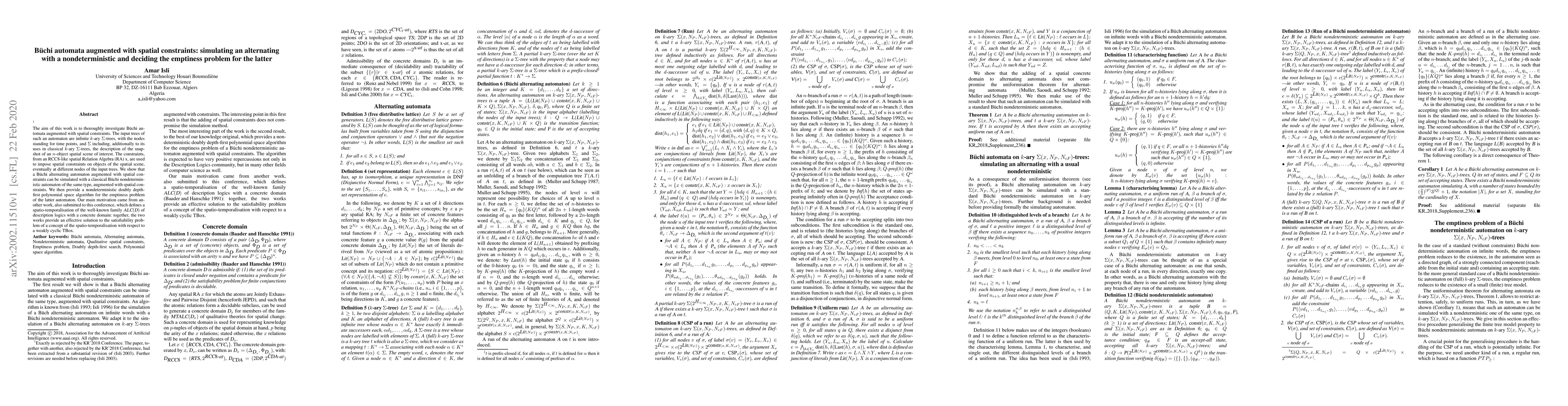 The aim of this work is to thoroughly investigate Buchi automata augmented with spatial constraints. The input trees of such an automaton are infinite k-ary Sigma-trees, with the nodes standing for time points, and Sigma including, additionally to its uses in classical k-ary Sigma-trees, the description of the snapshot of an n-object spatial scene of interest. The constraints, from an RCC8-like spatial Relation Algebra (RA) x, are used to impose spatial constraints on objects of the spatial scene, eventually at different nodes of the input trees. We show that a Buchi alternating automaton augmented with spatial constraints can be simulated with a classical Buchi nondeterministic automaton of the same type, augmented with spatial constraints. We then provide a nondeterministic doubly depth-first polynomial space algorithm for the emptiness problem of the latter automaton. Our main motivation came from another work, also submitted to this conference, which defines a spatio-temporalisation of the well-known family ALC(D) of description logics with a concrete domain: together, the two works provide an effective solution to the satisfiability problem of a concept of the spatio-temporalisation with respect to a weakly cyclic TBox.