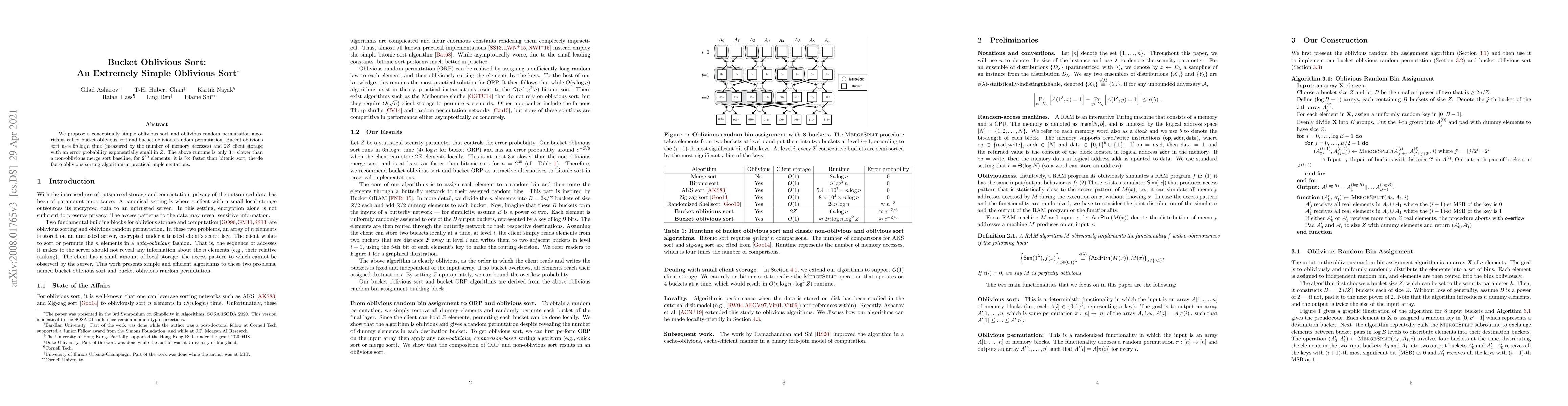 Bucket oblivious sort presents a simple, efficient oblivious sorting algorithm that requires $6n\log n$ time and $2Z$ client storage, outperforming bitonic sort in practical implementations for large datasets. Its runtime is only three times slower than non-oblivious merge sort.