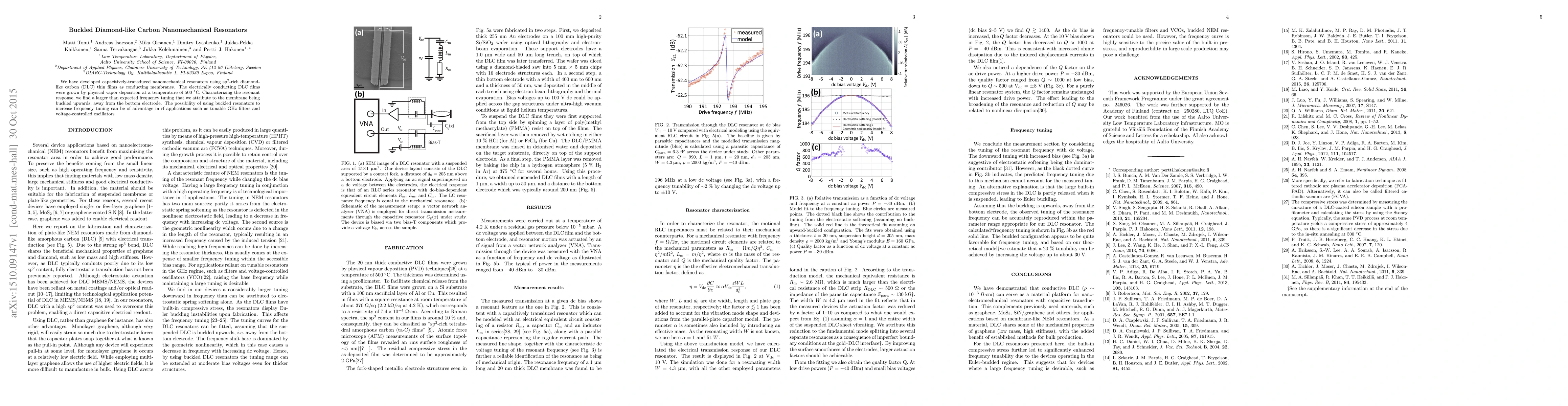 This research develops capacitively-transduced nanomechanical resonators from sp$^2$-rich diamond-like carbon films, finding enhanced frequency tuning due to upward buckling of the membrane. This innovation could improve GHz filter and oscillator performance in RF applications.