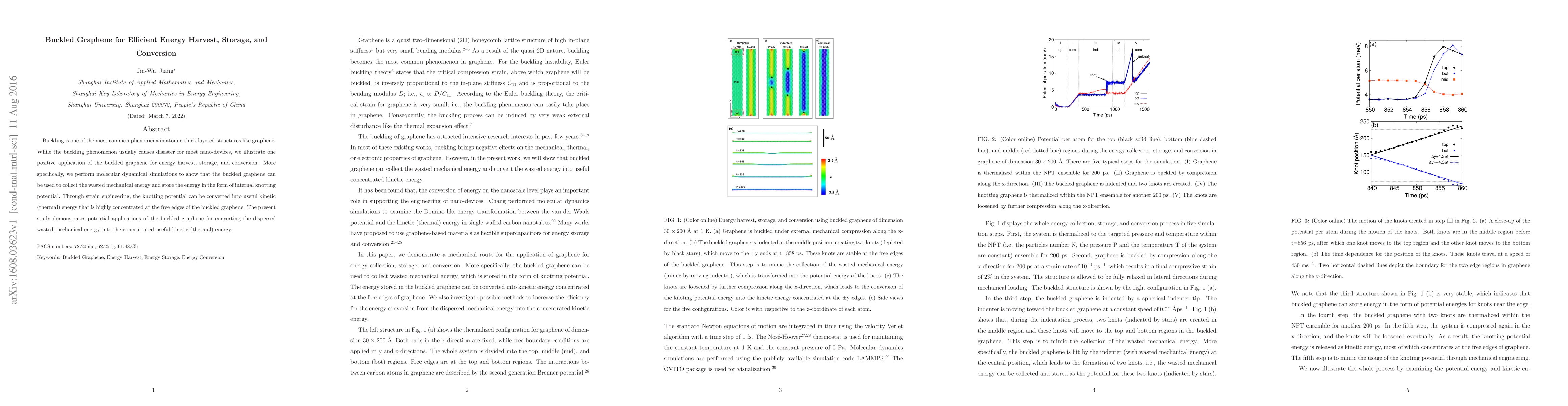 Summary: This paper demonstrates that buckled graphene can efficiently harvest and store mechanical energy through internal knotting potential, which can then be converted into concentrated kinetic (thermal) energy via strain engineering, showcasing its potential for energy conversion applications.