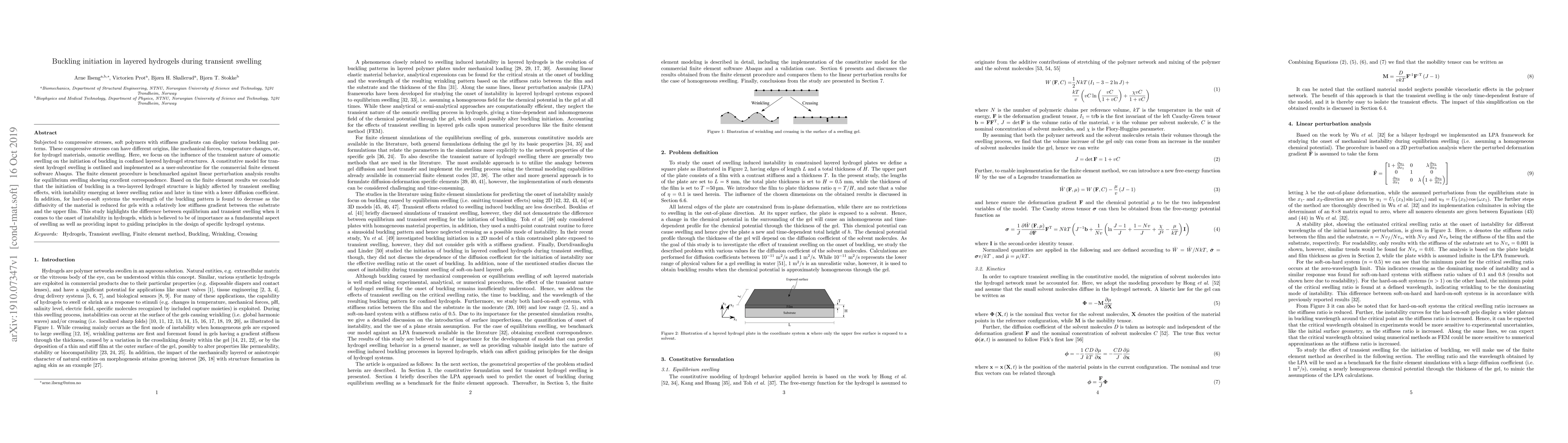 This study investigates how transient osmotic swelling affects buckling initiation in layered hydrogels under compressive stress. The research develops a constitutive model for transient swelling, implementing it in Abaqus for finite element analysis, and finds that transient swelling causes buckling at lower swelling ratios and with lower diffusion coefficients compared to equilibrium swelling.