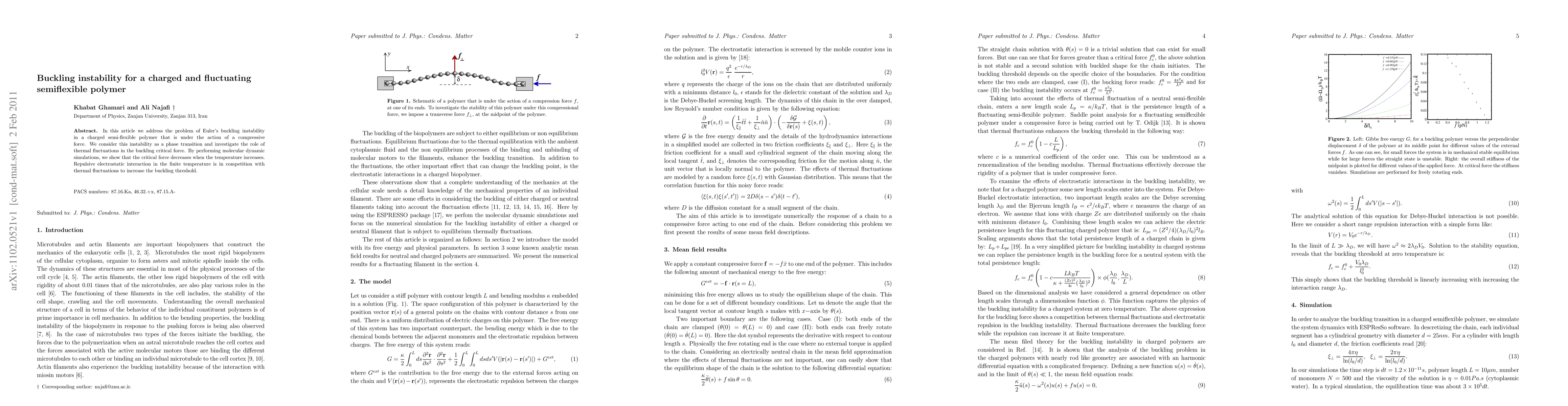 In this article we address the problem of Euler's buckling instability in a charged semi-flexible polymer that is under the action of a compressive force. We consider this instability as a phase transition and investigate the role of thermal fluctuations in the buckling critical force. By performing molecular dynamic simulations, we show that the critical force decreases when the temperature increases. Repulsive electrostatic interaction in the finite temperature is in competition with thermal fluctuations to increase the buckling threshold.
