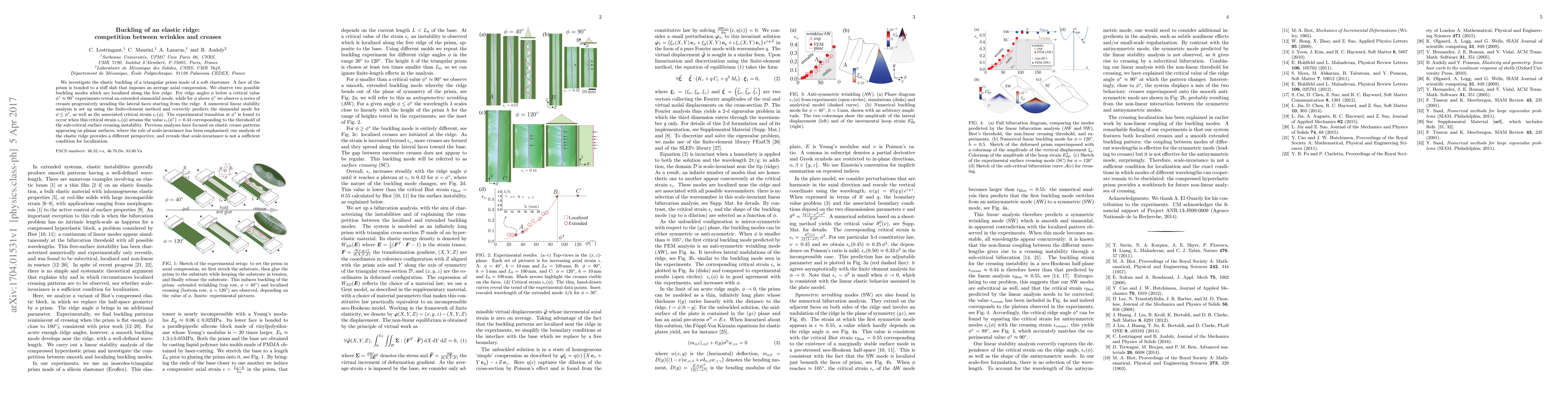 We investigate the elastic buckling of a triangular prism made of a soft elastomer. A face of the prism is bonded to a stiff slab that imposes an average axial compression. We observe two possible buckling modes which are localized along the free ridge. For ridge angles $\phi$ below a critical value $\phi^\star\approx 90^\circ$ experiments reveal an extended sinusoidal mode, while for $\phi$ above $\phi^\star$ we observe a series of creases progressively invading the lateral faces starting from the ridge. A numerical linear stability analysis is set up using the finite-element method and correctly predicts the sinusoidal mode for $\phi \leq \phi^\star$, as well as the associated critical strain $\epsilon_{\mathrm{c}}(\phi)$. The experimental transition at $\phi^\star$ is found to occur when this critical strain $\epsilon_{\mathrm{c}}(\phi)$ attains the value $\epsilon_{\mathrm{c}}(\phi^\star) = 0.44$ corresponding to the threshold of the sub-critical surface creasing instability. Previous analyses have focused on elastic crease patterns appearing on planar surfaces, where the role of scale-invariance has been emphasized; our analysis of the elastic ridge provides a different perspective, and reveals that scale-invariance is not a sufficient condition for localization.