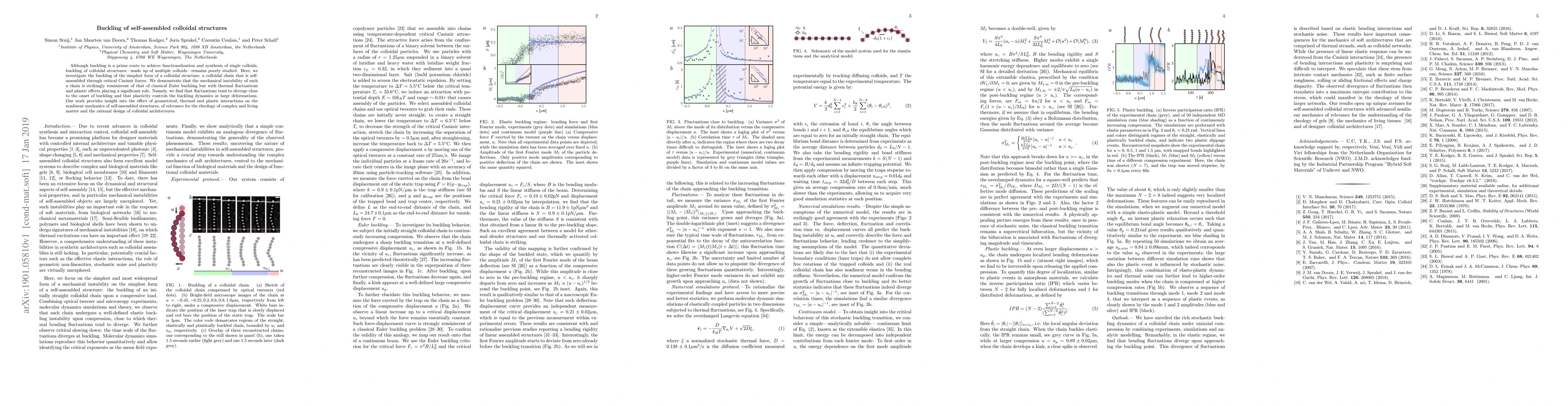 Although buckling is a prime route to achieve functionalization and synthesis of single colloids, buckling of colloidal structures---made up of multiple colloids---remains poorly studied. Here, we investigate the buckling of the simplest form of a colloidal structure, a colloidal chain that is self-assembled through critical Casimir forces. We demonstrate that the mechanical instability of such a chain is strikingly reminiscent of that of classical Euler buckling but with thermal fluctuations and plastic effects playing a significant role. Namely, we find that fluctuations tend to diverge close to the onset of buckling and that plasticity controls the buckling dynamics at large deformations. Our work provides insight into the effect of geometrical, thermal and plastic interactions on the nonlinear mechanics of self-assembled structures, of relevance for the rheology of complex and living matter and the rational design of colloidal architectures.