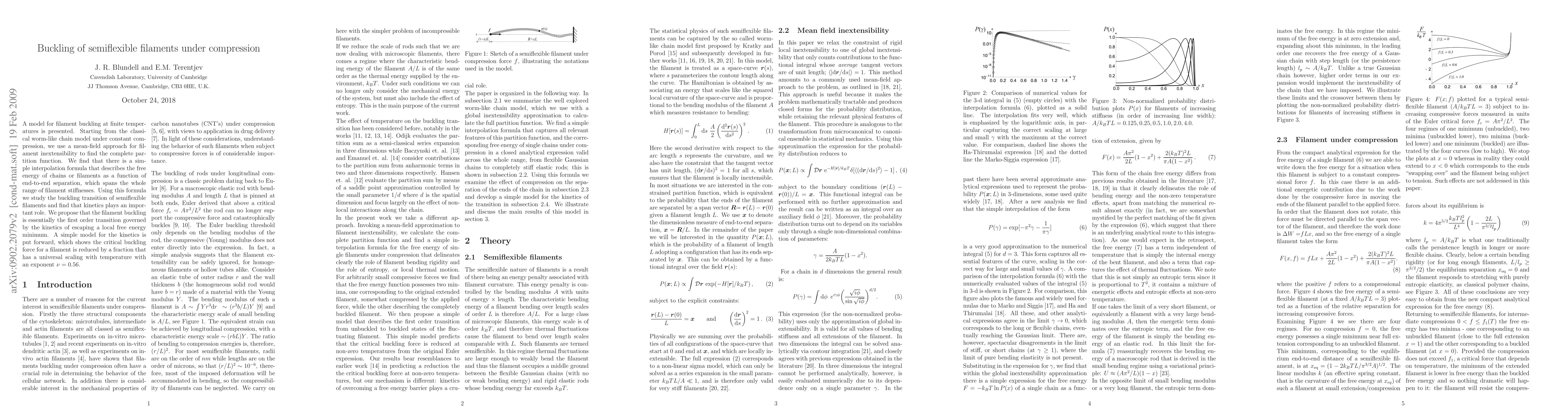 This paper presents a model for filament buckling under compression, using a mean-field approach to describe the free energy and predict the buckling transition as a first-order process governed by kinetic factors. The critical buckling force decreases with temperature following a universal scaling law with an exponent of 0.56.
