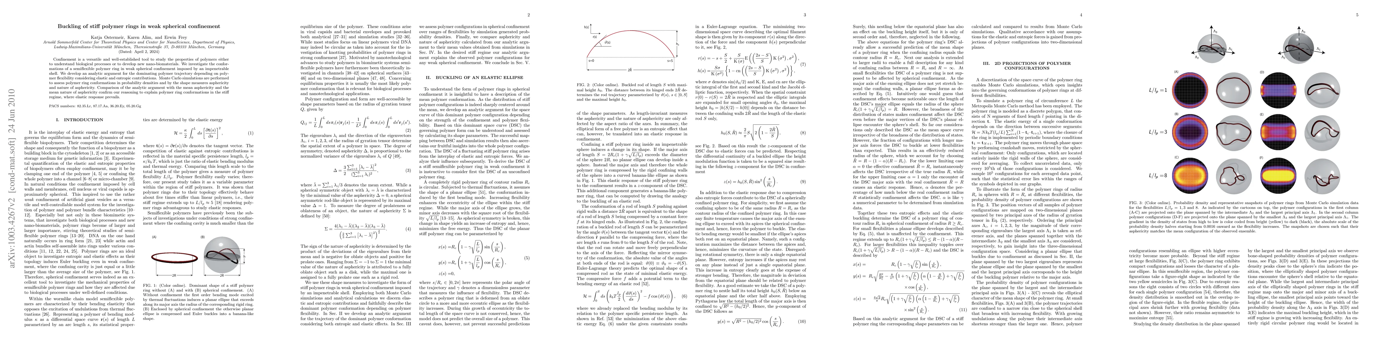 This paper investigates the buckling behavior of stiff polymer rings confined within a weak spherical shell, developing an analytic model to predict dominant conformations based on polymer flexibility. Monte Carlo simulations validate the model, confirming that elastic forces dominate in the stiff polymer regime.
