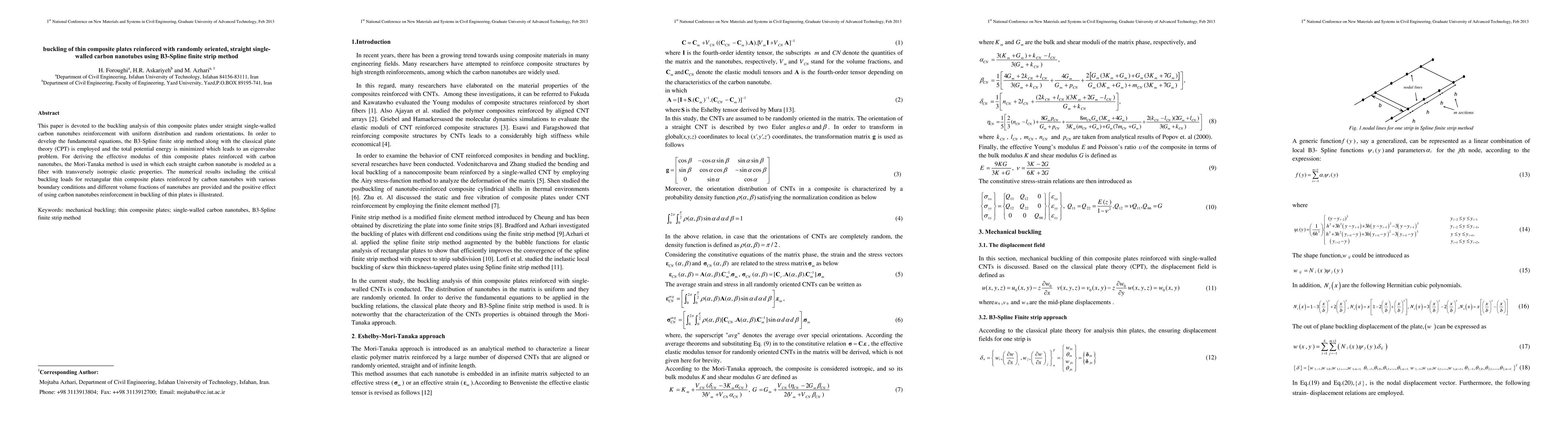 This paper analyzes the buckling behavior of thin composite plates reinforced with randomly oriented single-walled carbon nanotubes using the B3-Spline finite strip method, revealing the enhanced buckling resistance through numerical experiments. The Mori-Tanaka method is applied to determine the effective modulus, showcasing the positive impact of carbon nanotube reinforcement.